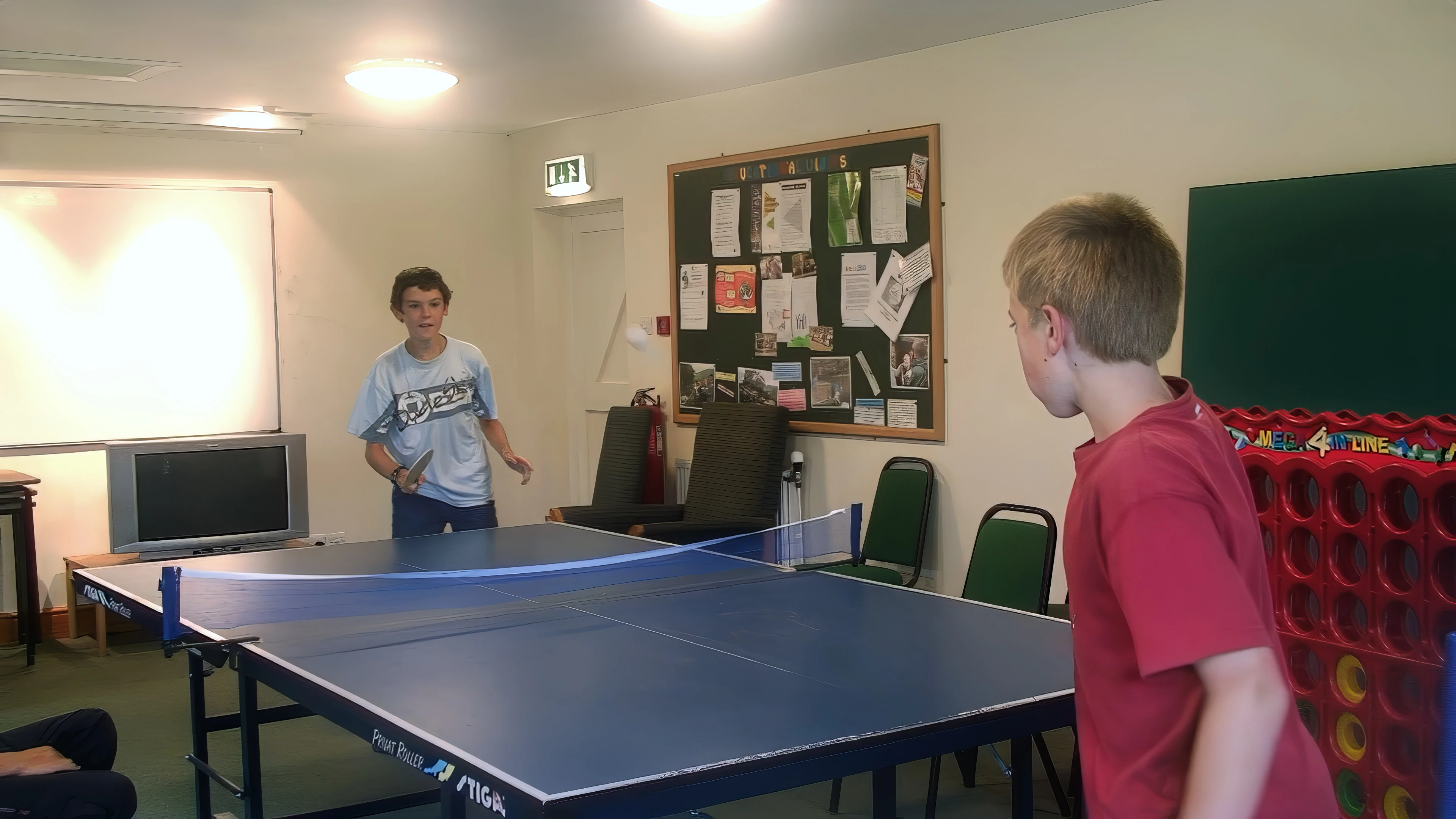 Freddie attempts to prove table-tennis supremacy in Borrowdale YH games room.