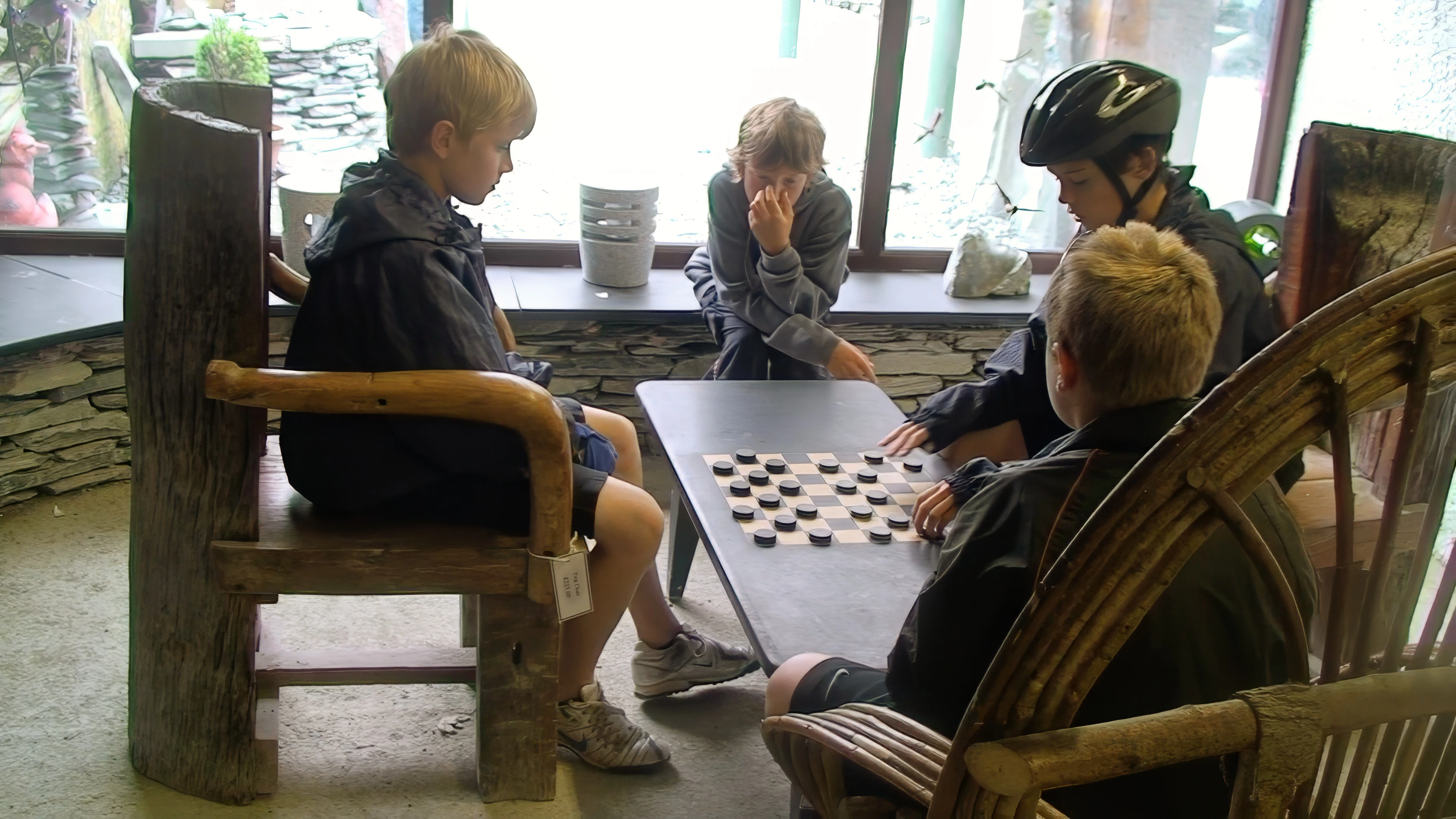 Olly and Freddie play slate draughts at Honister Slate Mine.