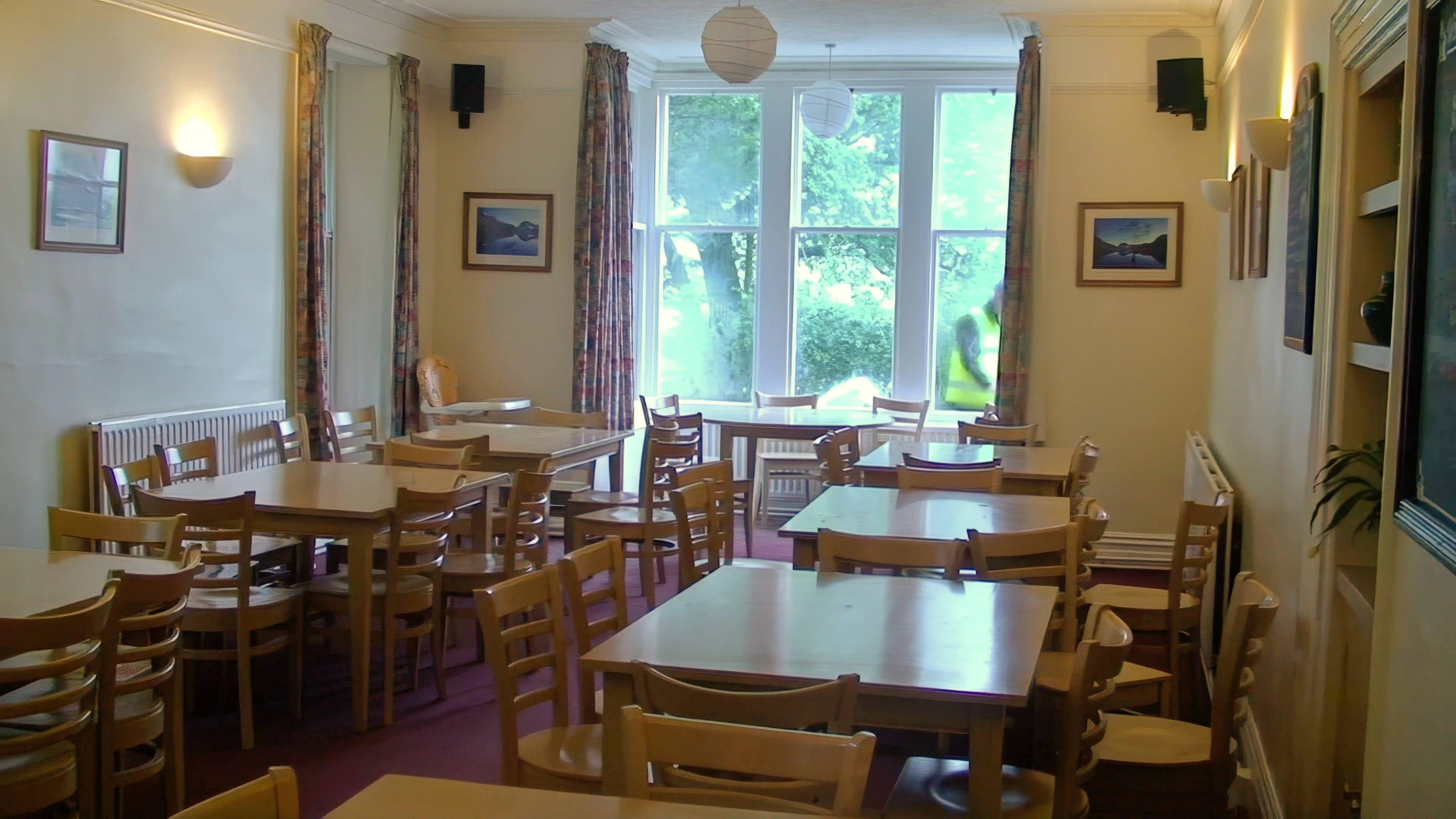 Buttermere YH dining room, with water dripping from a burst pipe above.