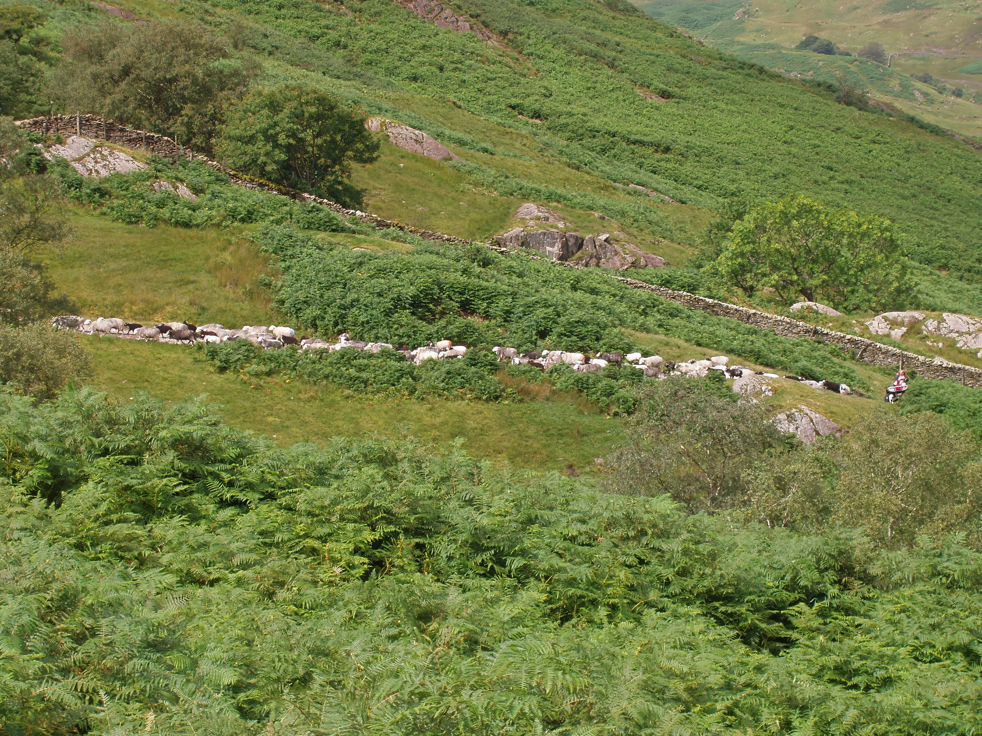 A farmer drives his flock up the Slater's Bridge bridleway—the easy route we missed.