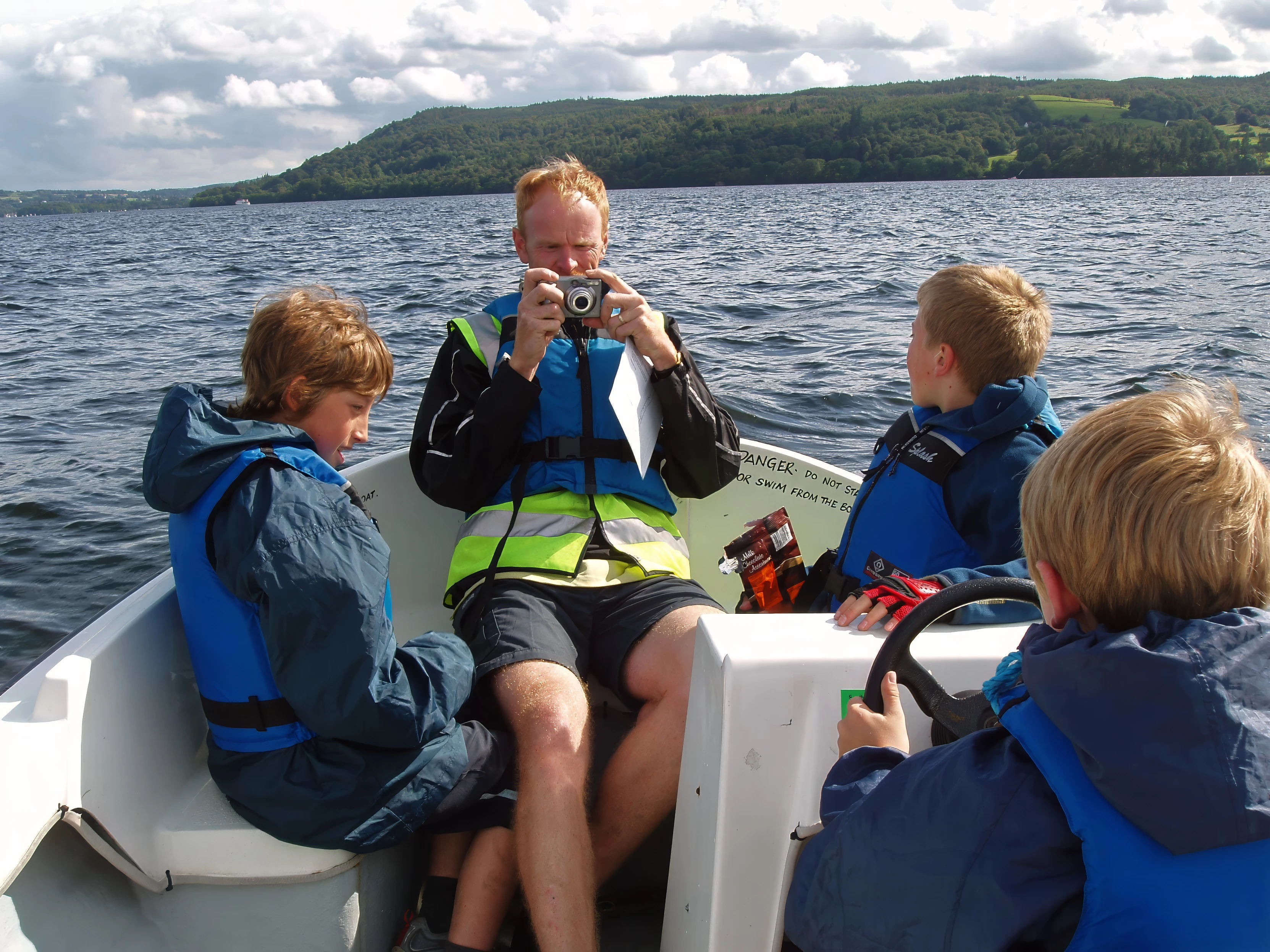 Olly at the helm of our motor boat on Windermere.