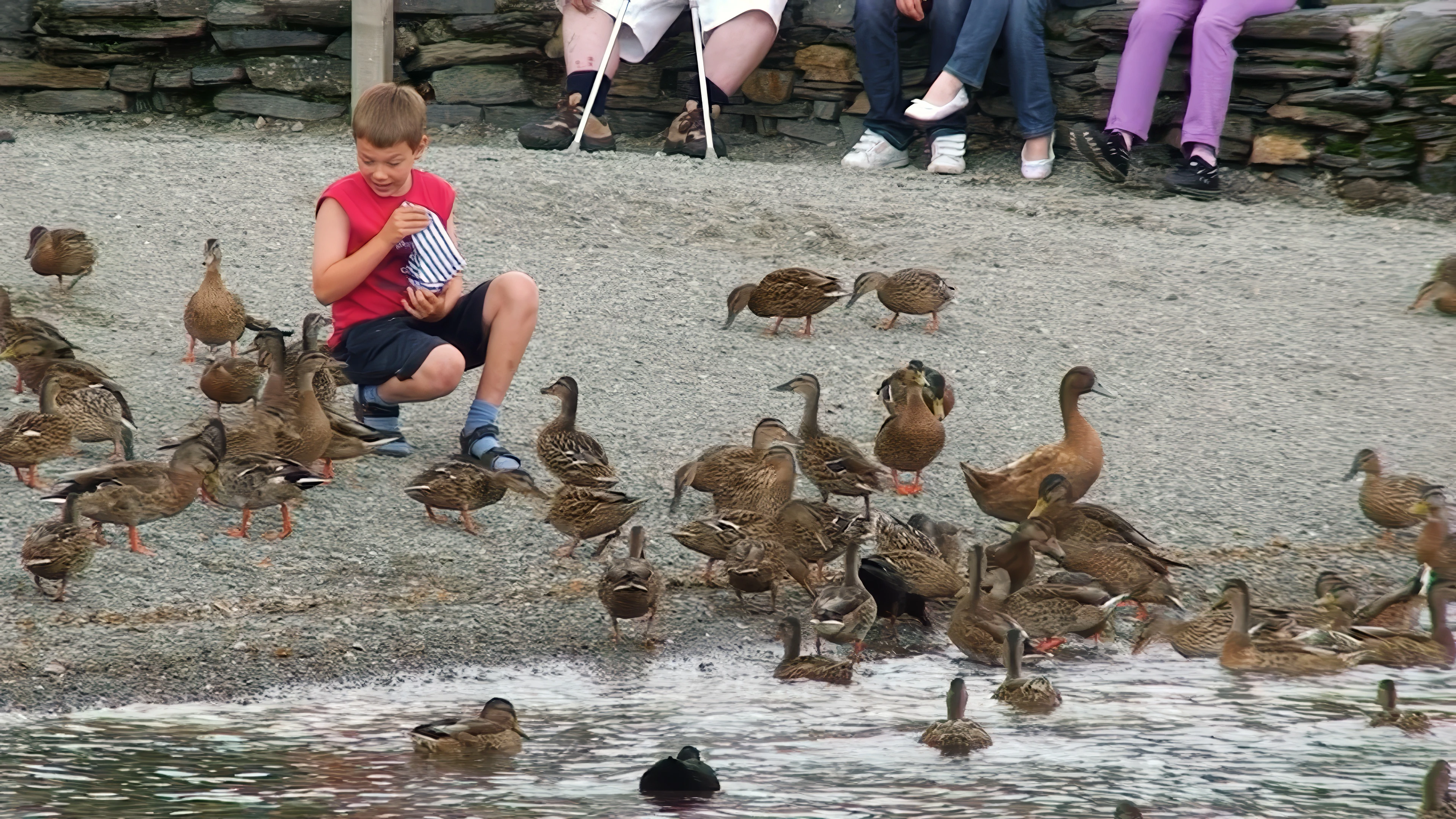 A young visitor feeds the ducks at Coniston Landing.