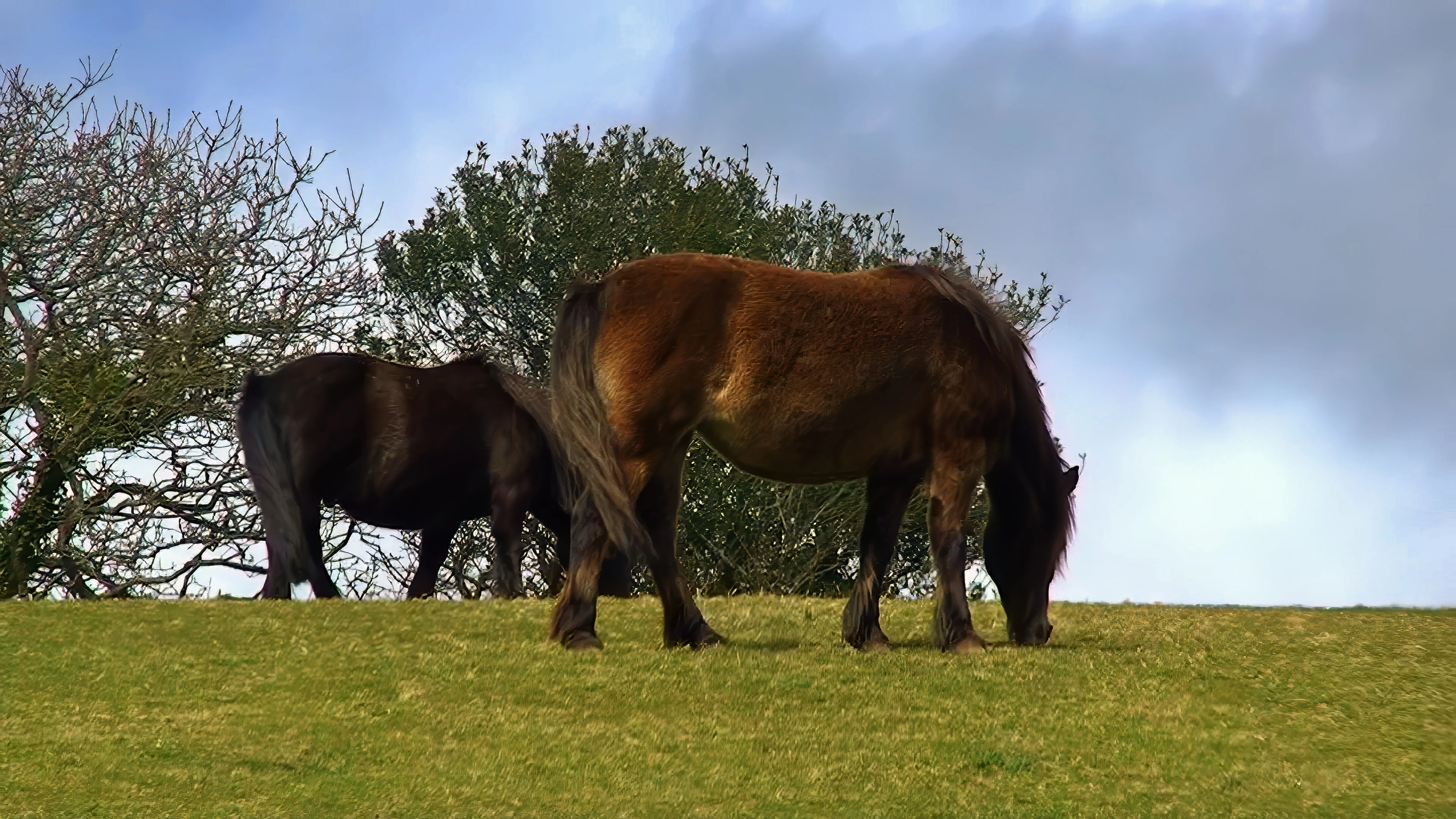 Horses grazing in fields around the Cornish Seal Sanctuary, Gweek.