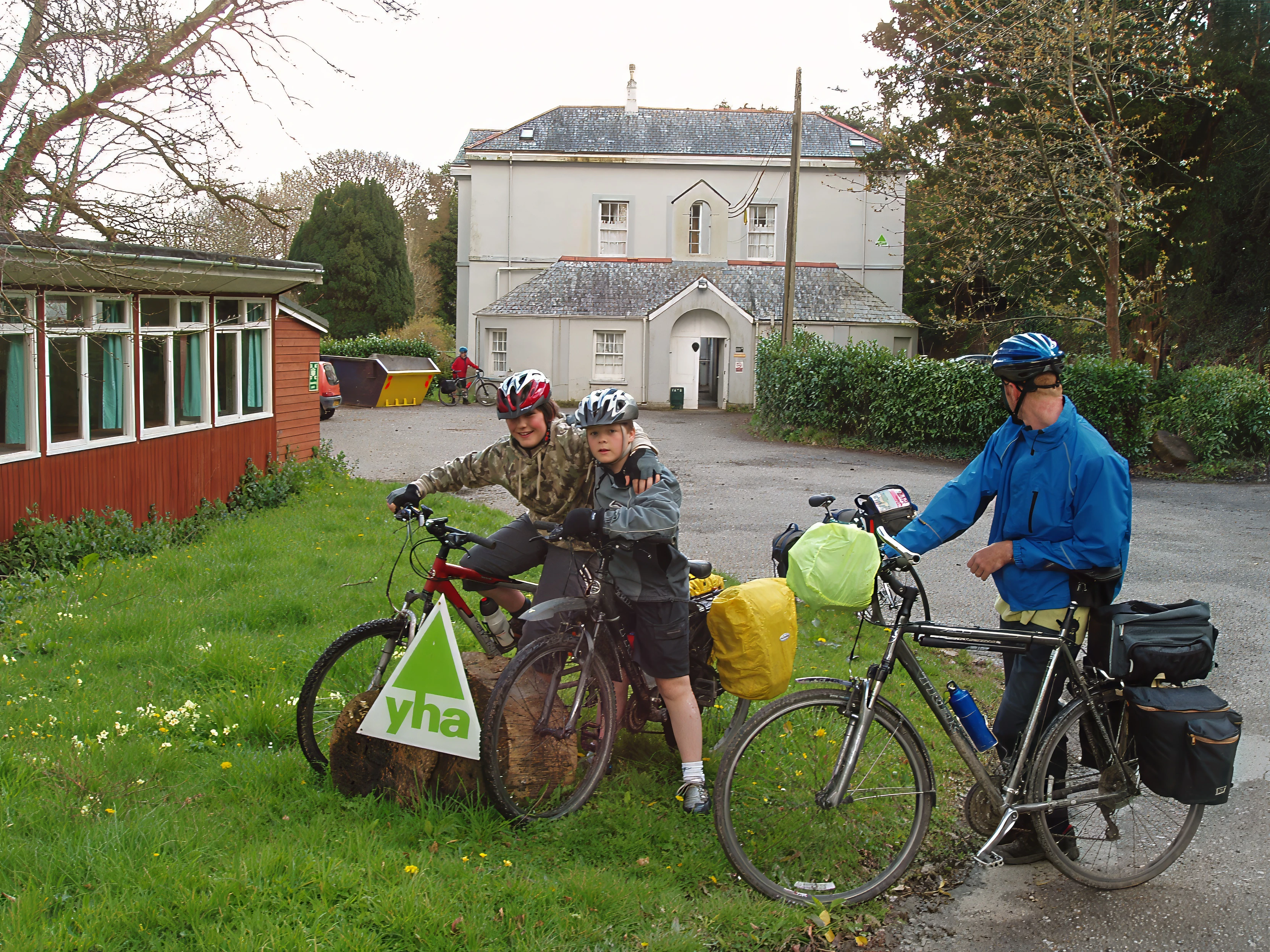 Zac, Ash and Charles, ready to leave Golant Youth Hostel.
