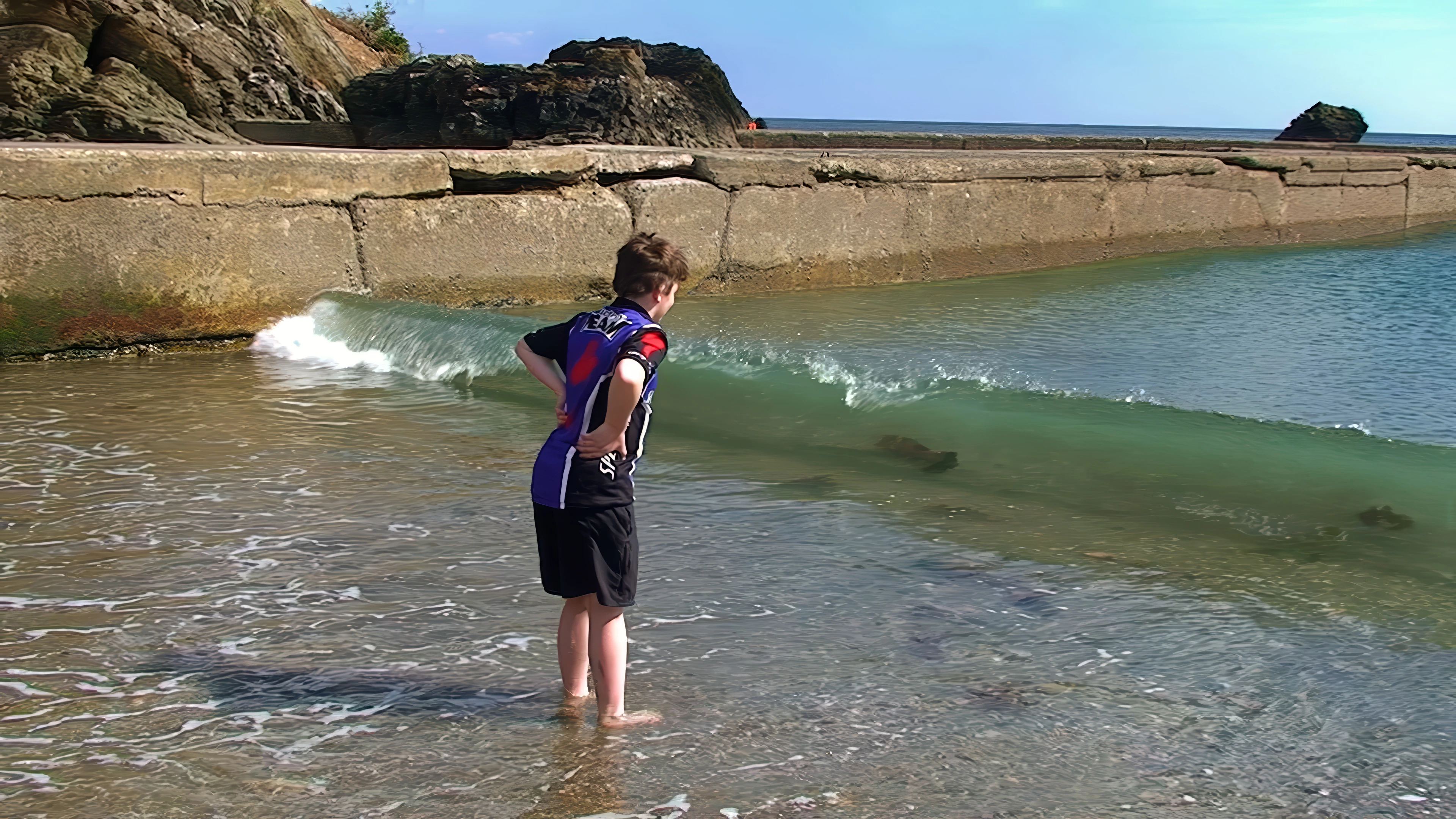 Ash finally gets his feet wet at Millendreath Beach — 15.3 miles in.