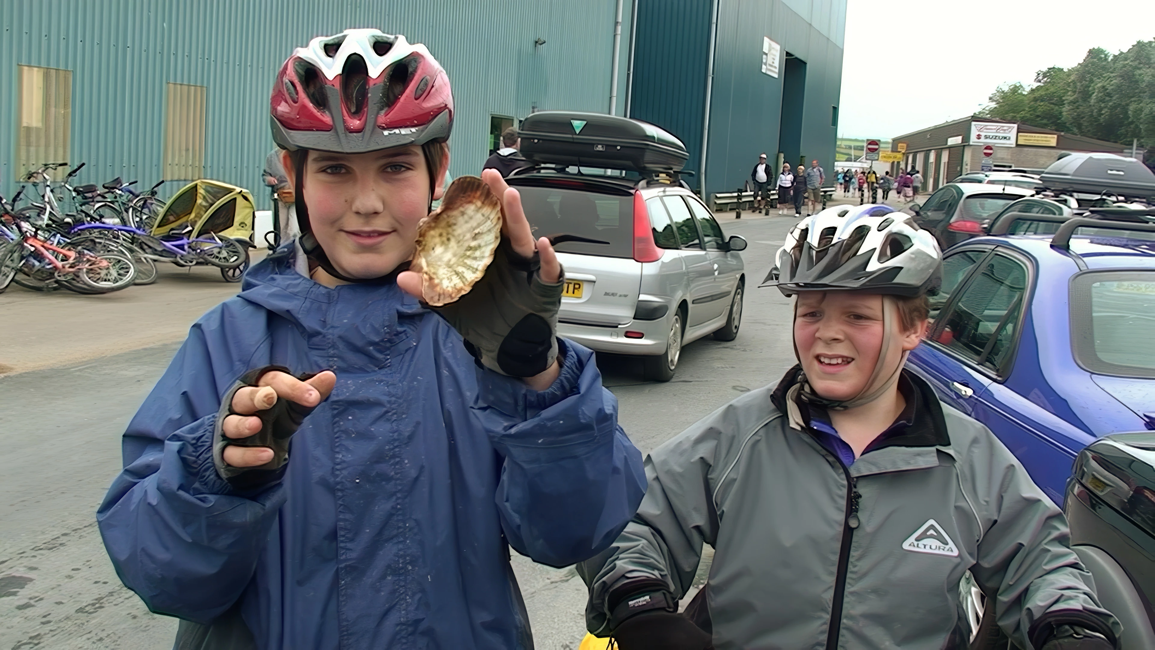 Zac shows off a large shell on the Camel Trail at South Quay, Padstow; 11.7 miles in.