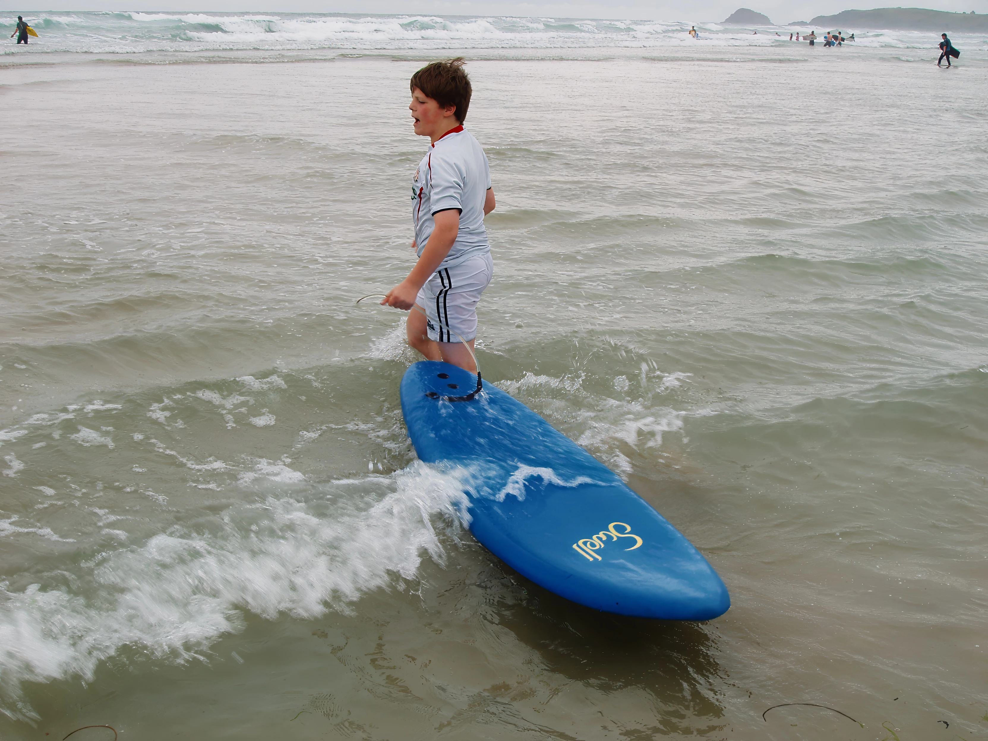 Ashley with his rented surfboard at Perranporth.