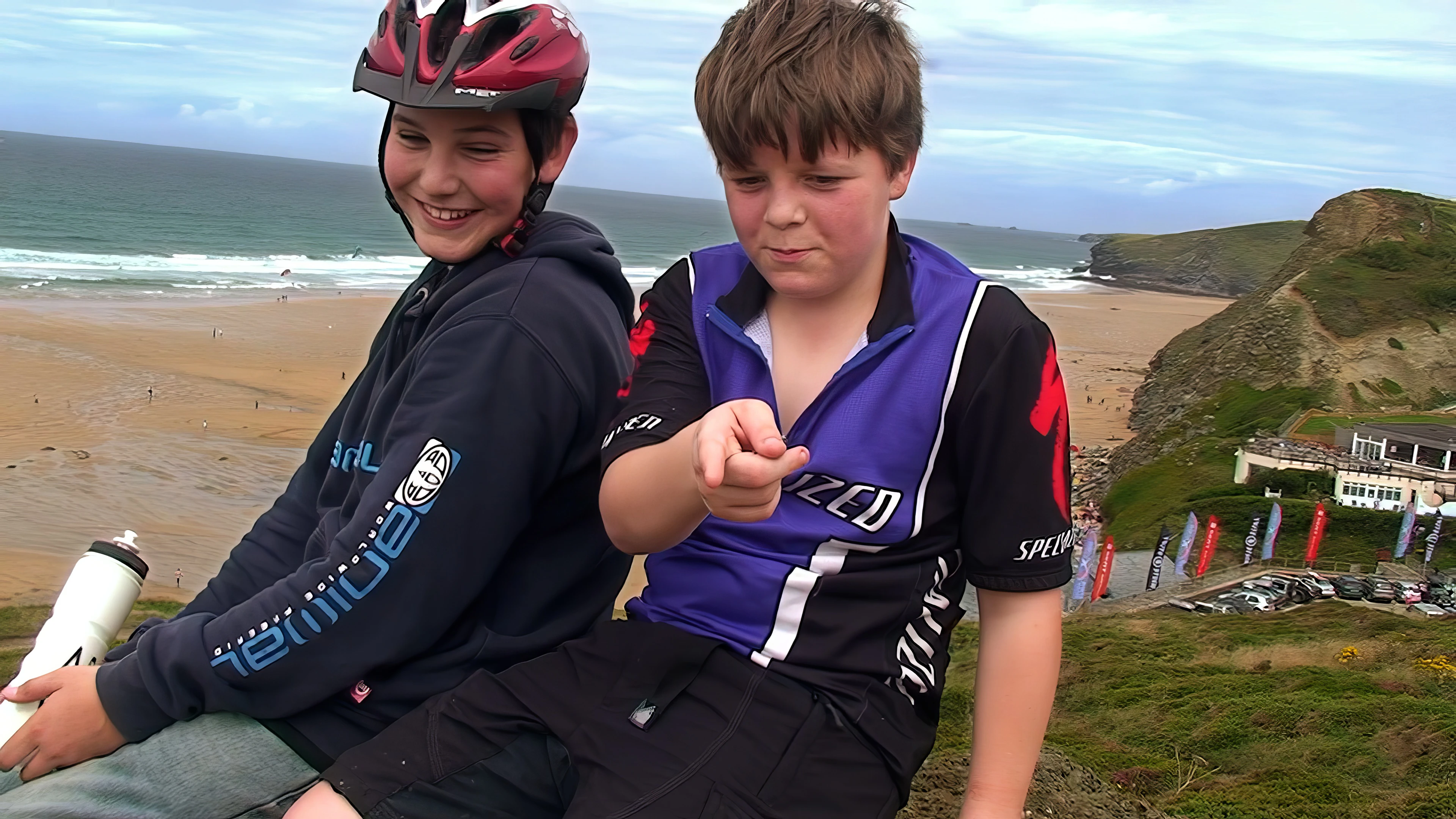 Zac and Ash take a well-earned rest overlooking Watergate Bay, 7.8 miles into the ride.