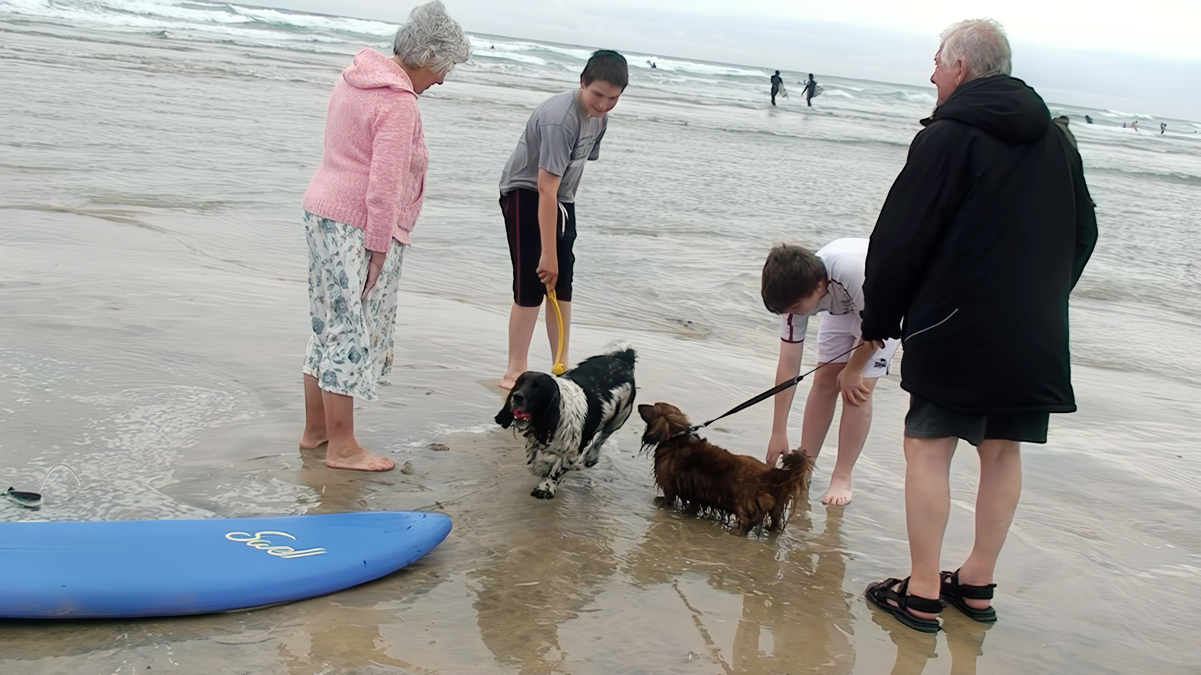 Ash and Zac chat with a couple and their two delightful dogs on Perranporth Beach.
