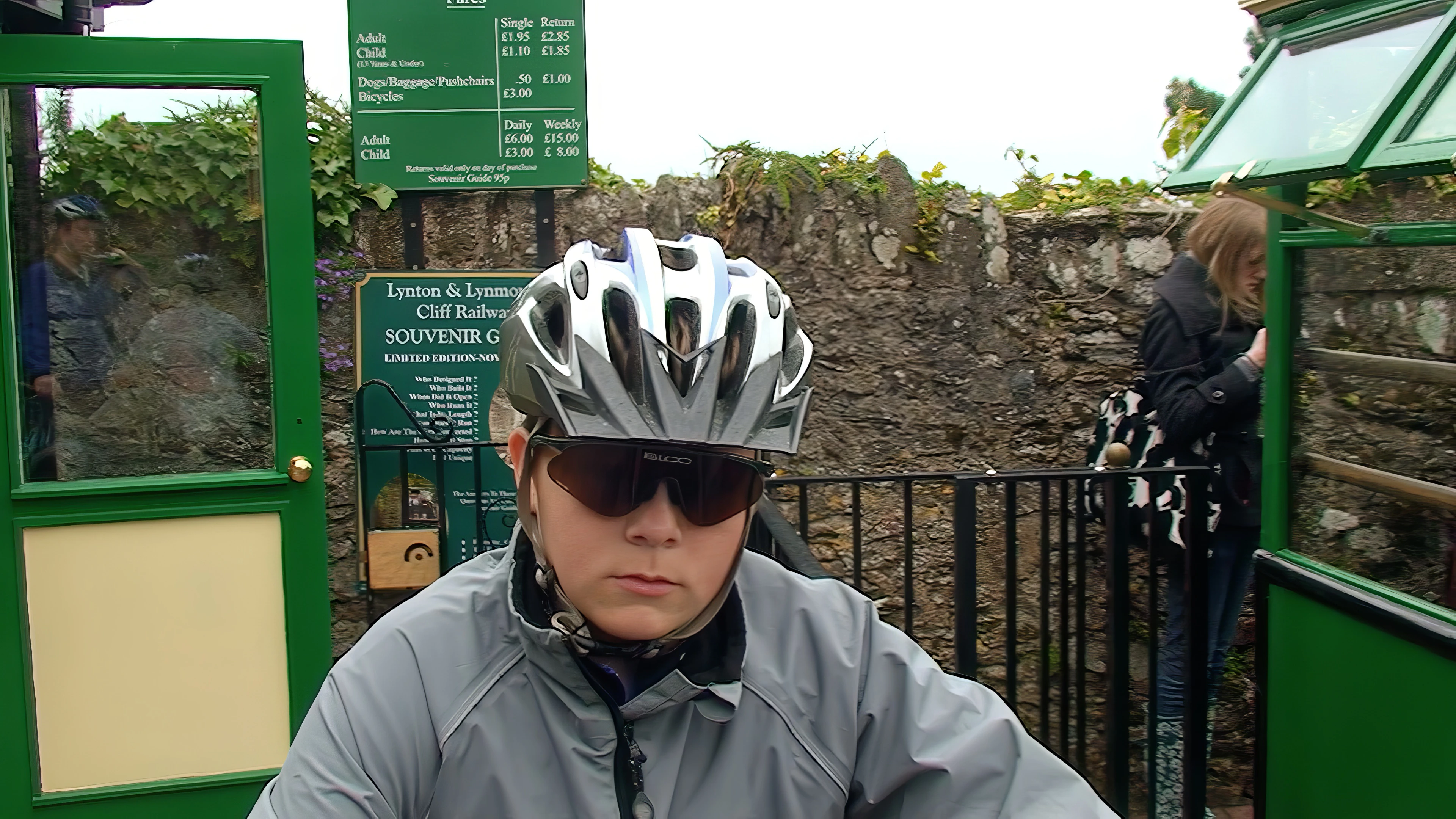 Ash at Lynton station on the Cliff Railway, in no hurry to start cycling.