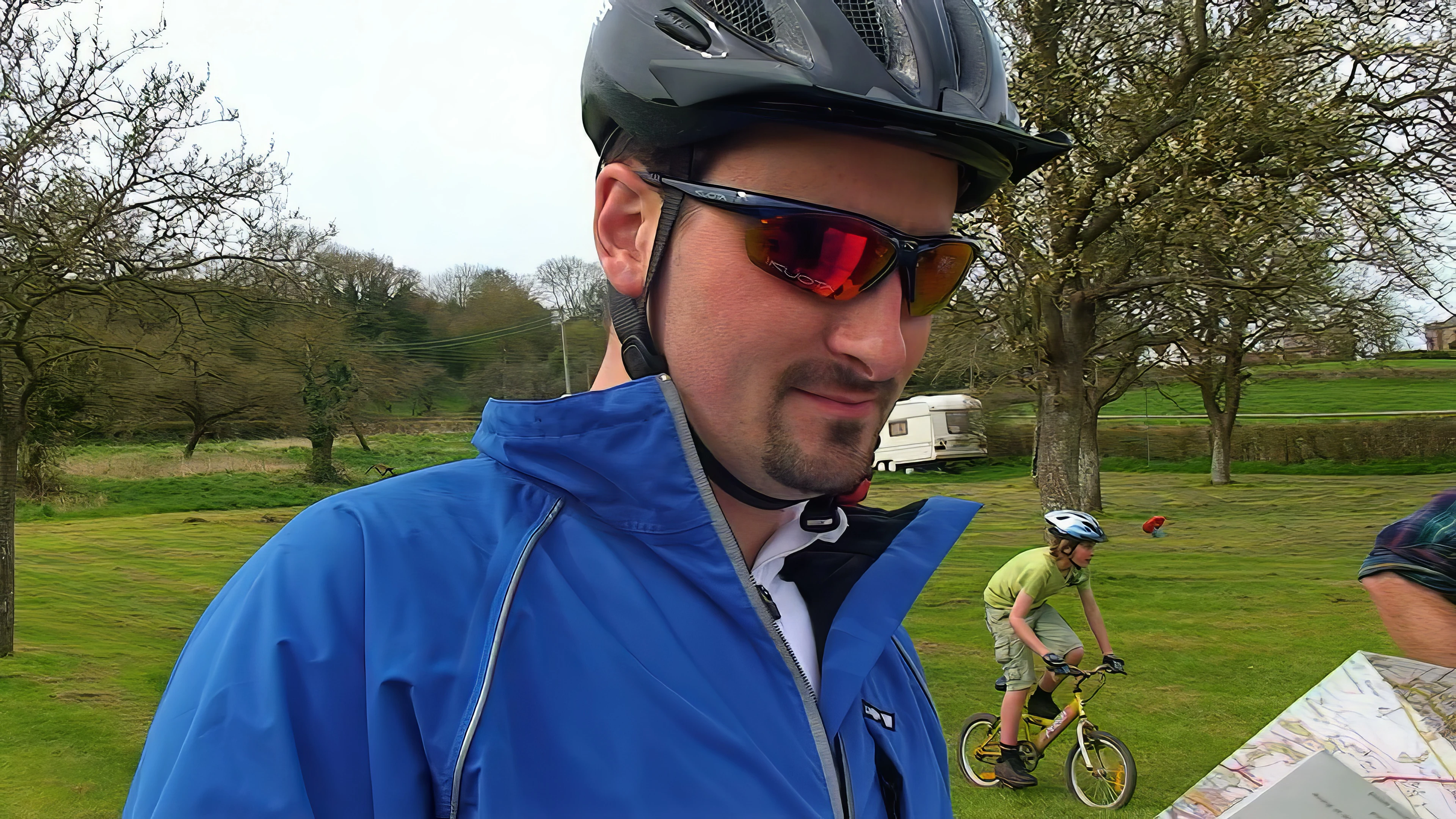 Hallam tries a tiny bike while Tao checks the map at Matthew’s relatives’ Panborough farm