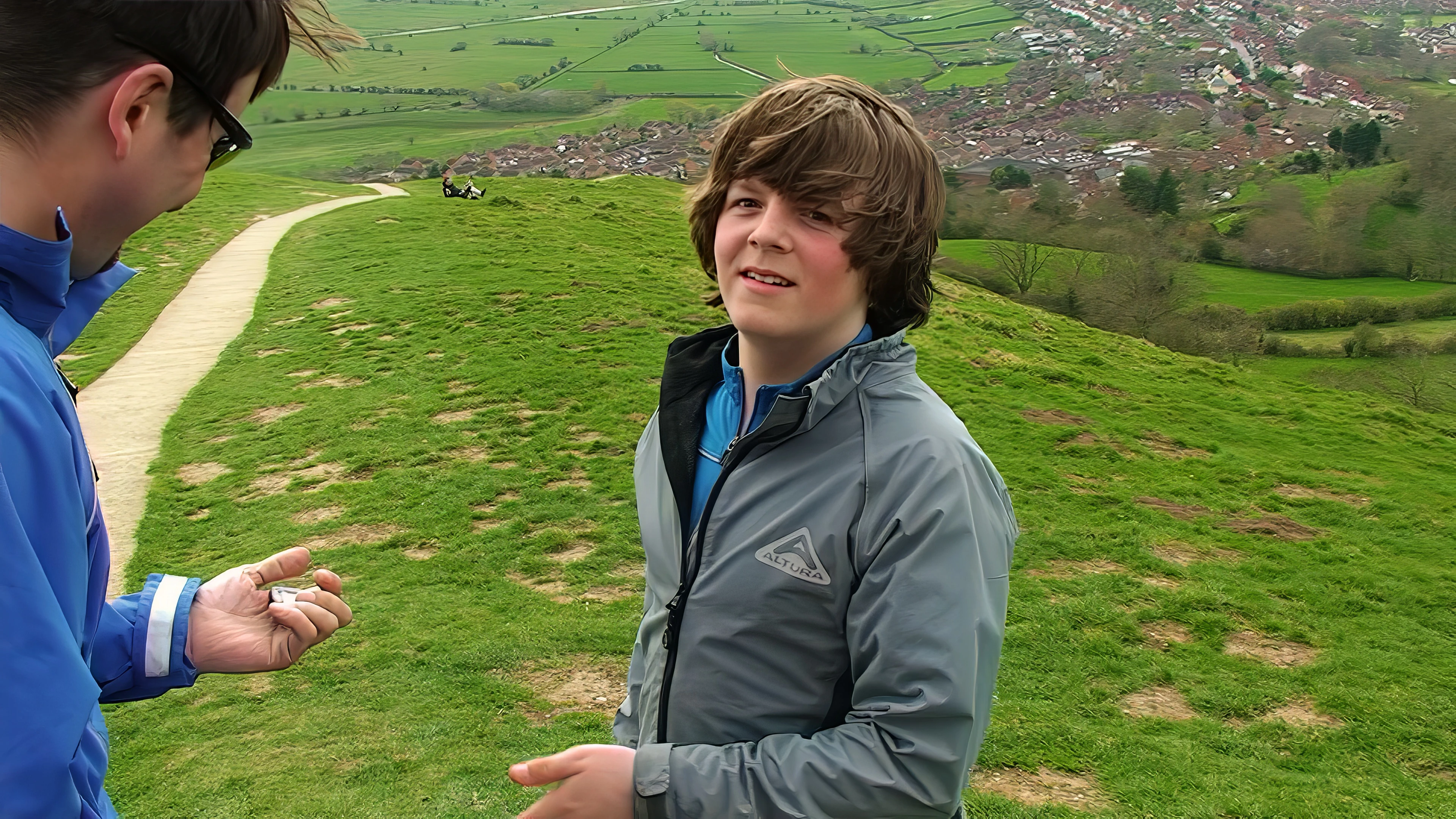 Ash hands his wallet and other valuables to Tao before rolling down Glastonbury Tor