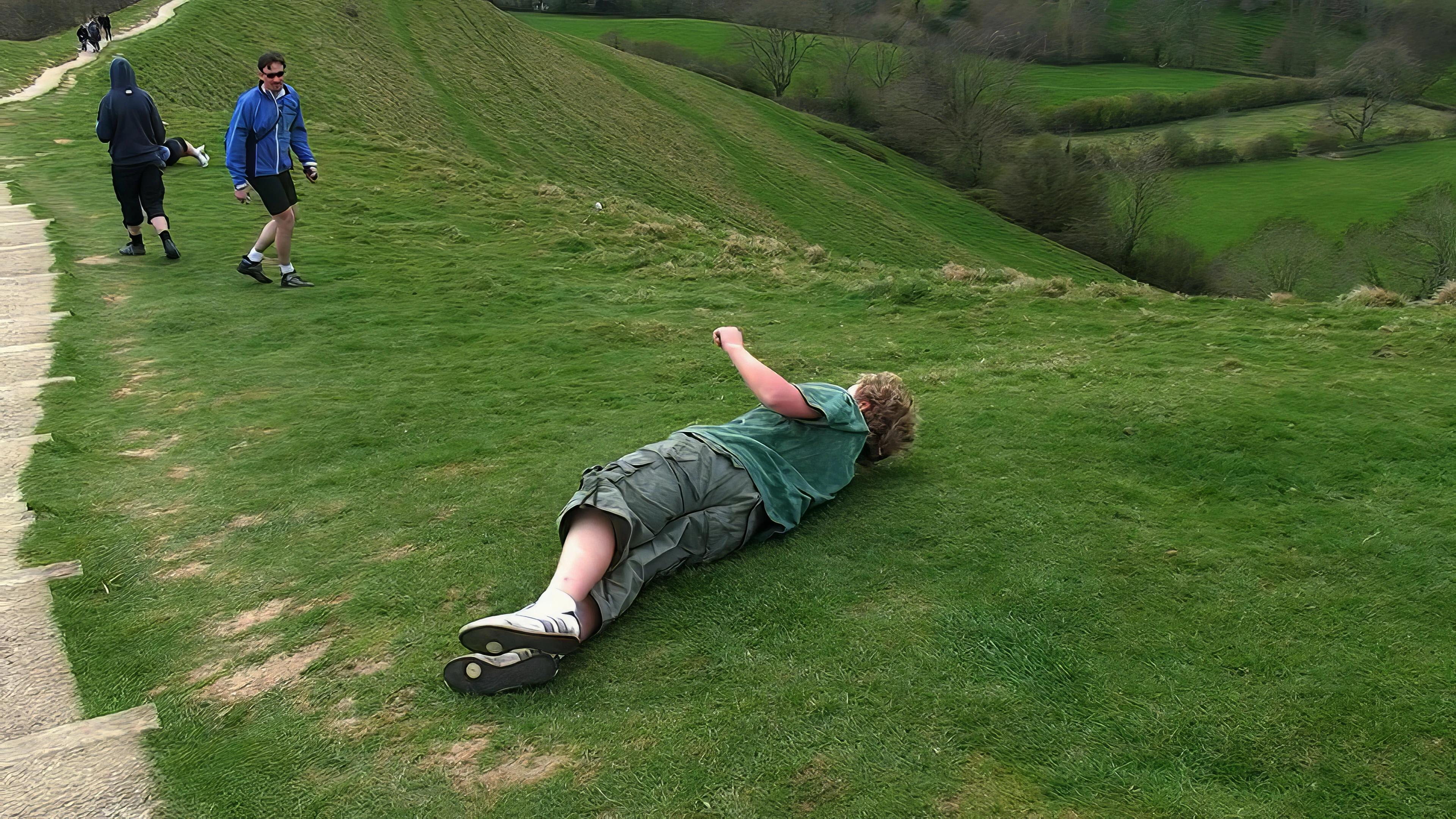 The youngsters take it in turns to roll from the top of Glastonbury Tor