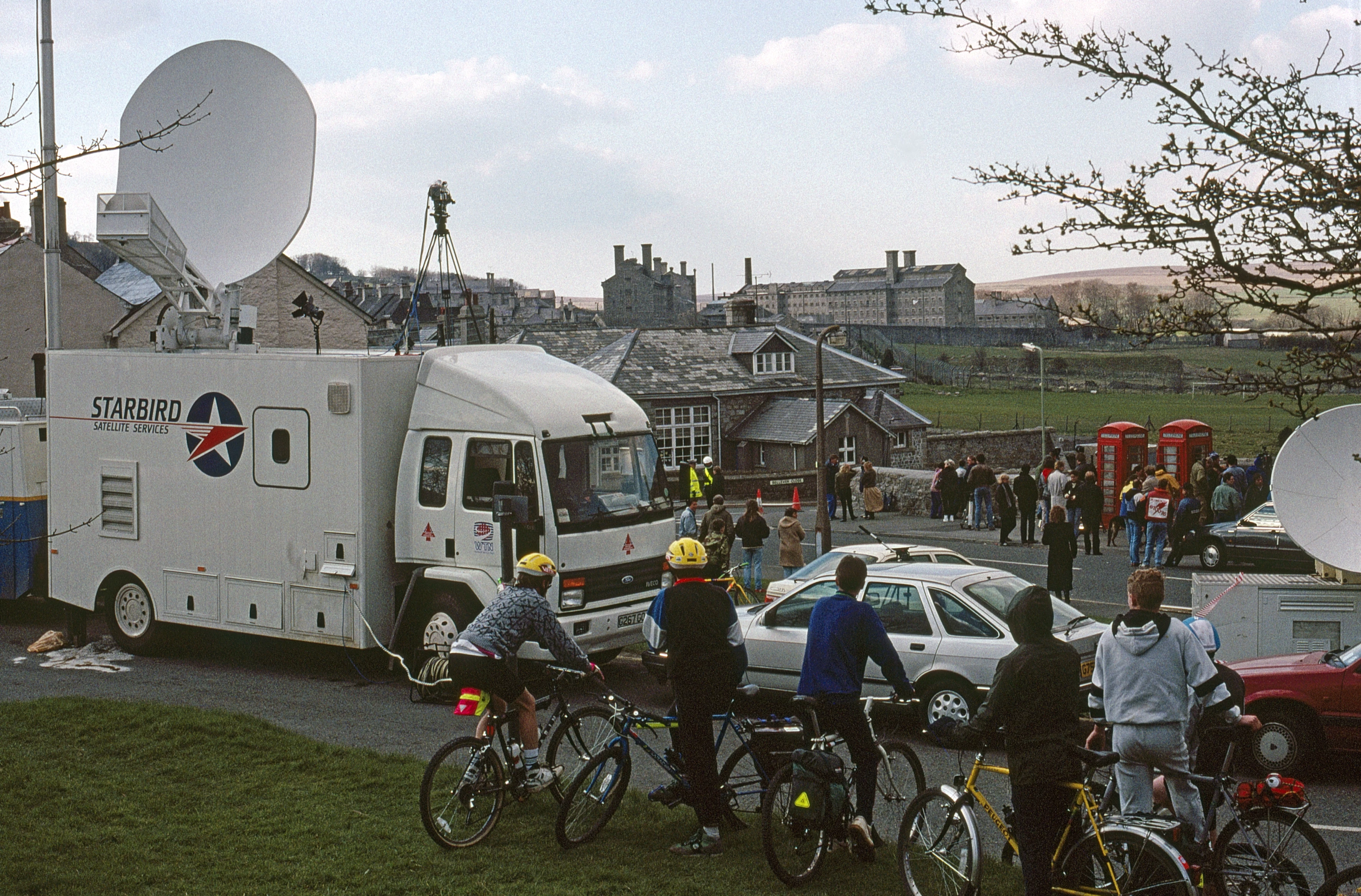 Television crews out in force at Princetown to cover the Dartmoor Prison riot.