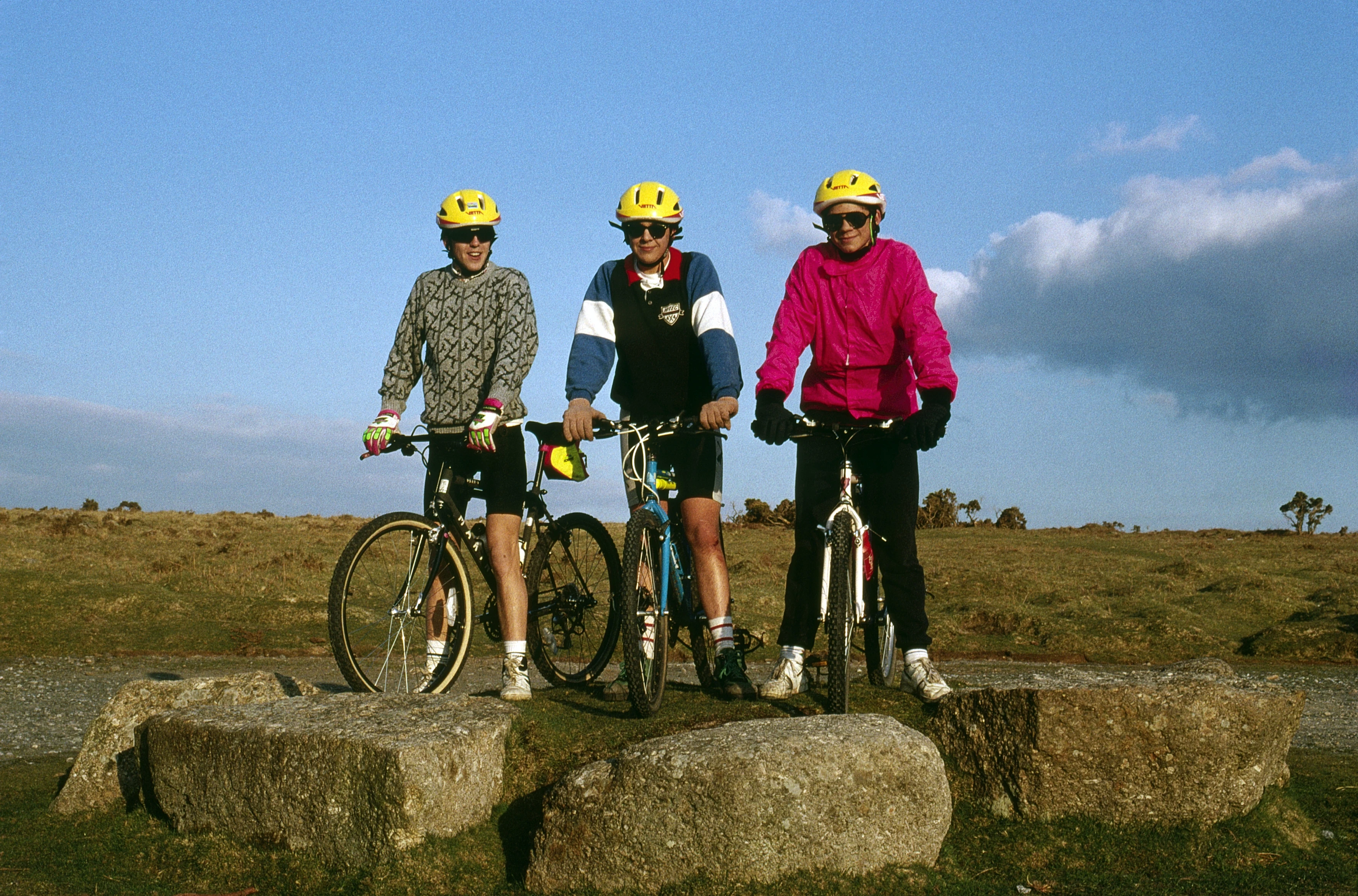 Julian Duquemin, Martin Hills and Dayle Guy pose on the stone island at Venford Reservoir car park.