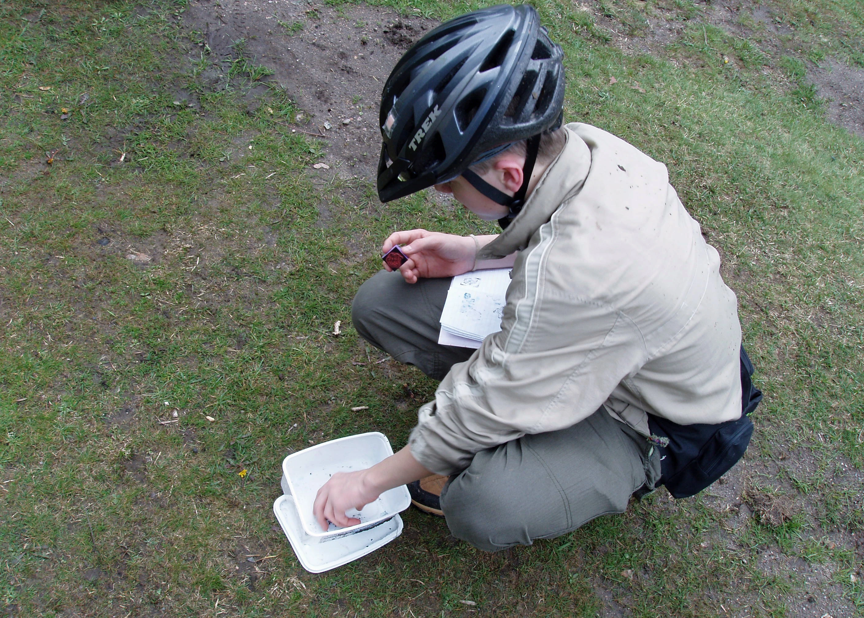 Gage inspects a Dartmoor letterbox by the River Avon, on the Shipley Bridge to Avon Dam path.