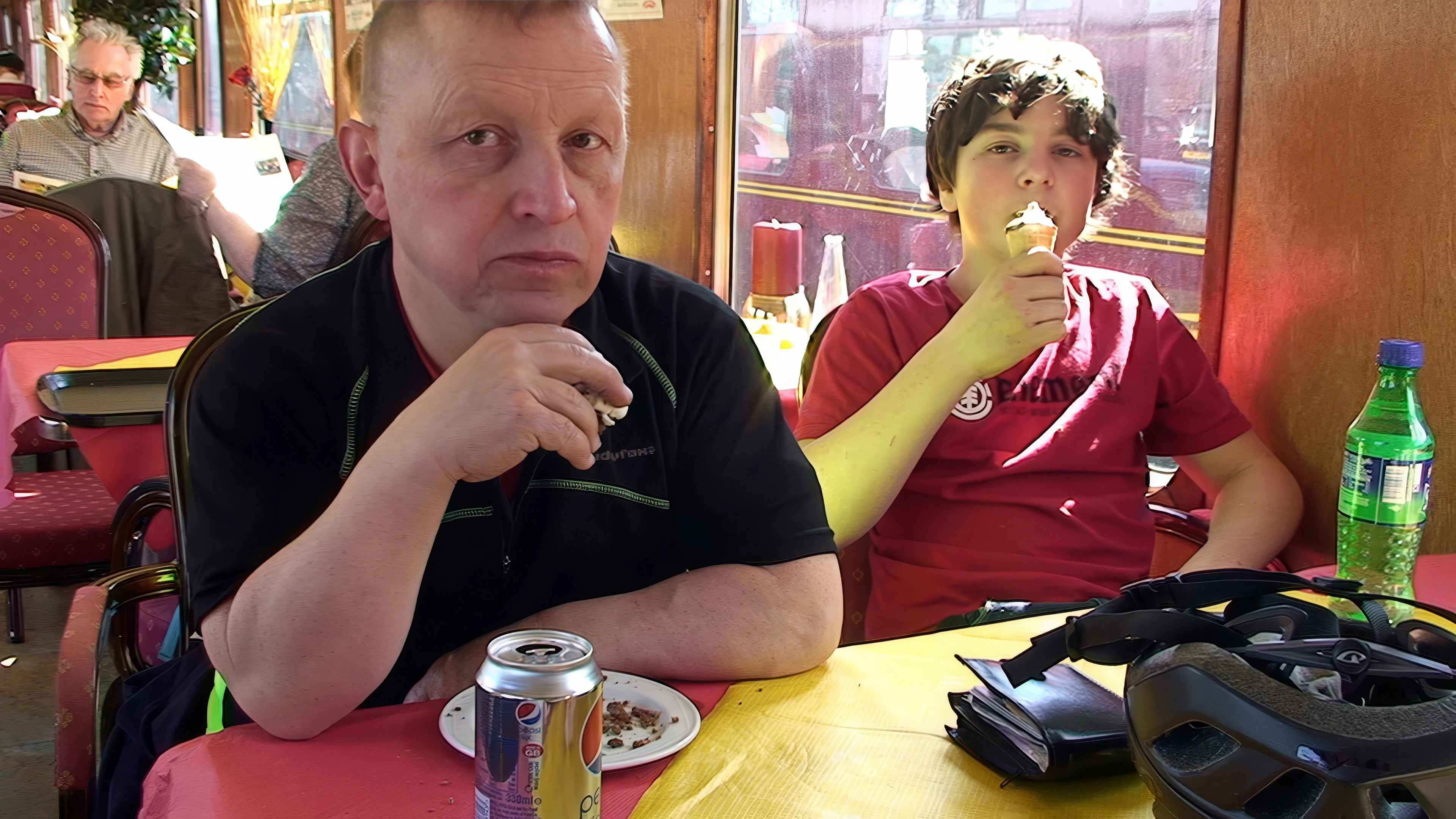 John and Lawrence in Bitton Station Café, 10.1 miles in.