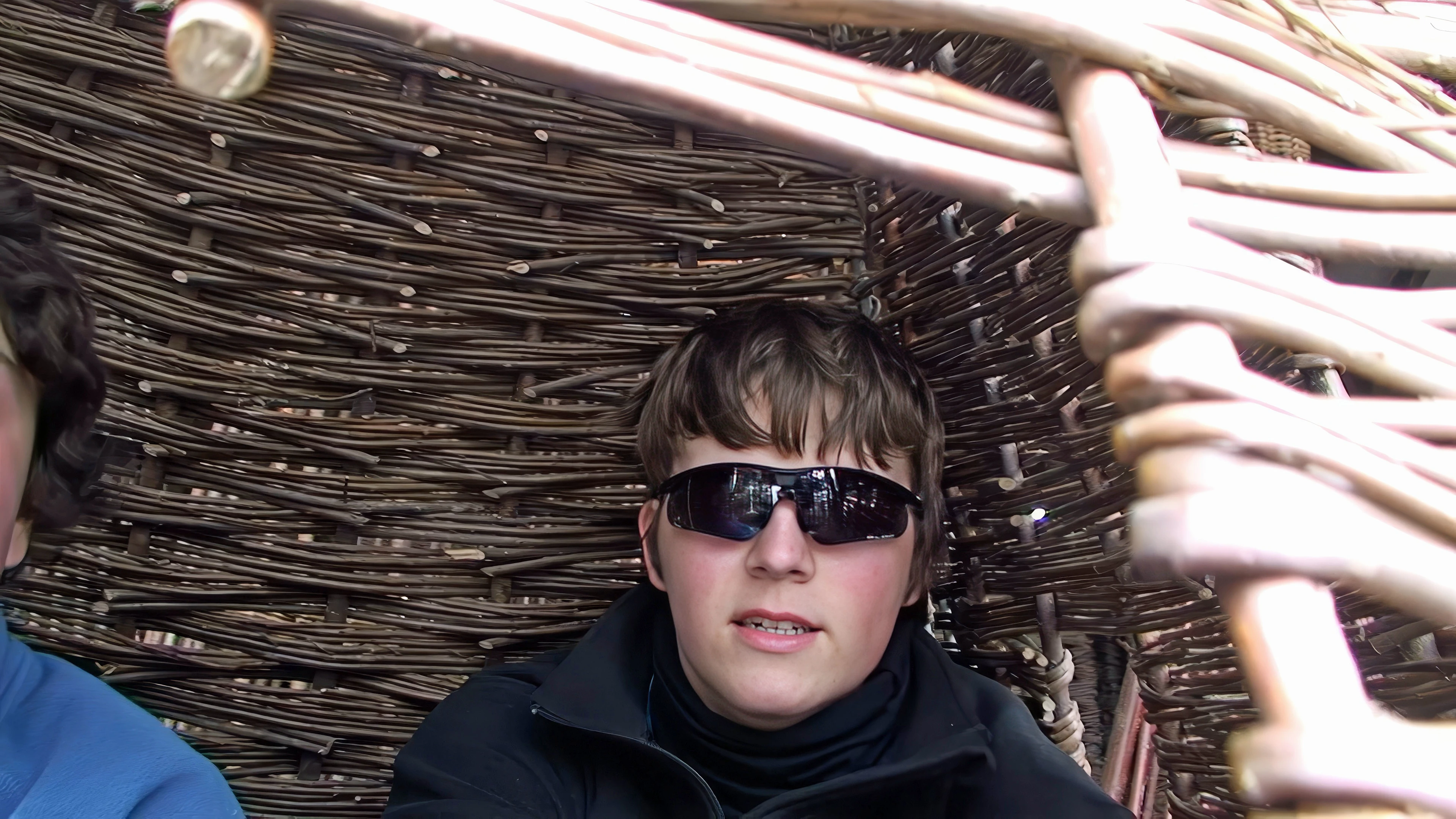 Ash and Lawrence try the hanging willow basket at the Willows & Wetlands Visitor Centre, Stoke Gregory