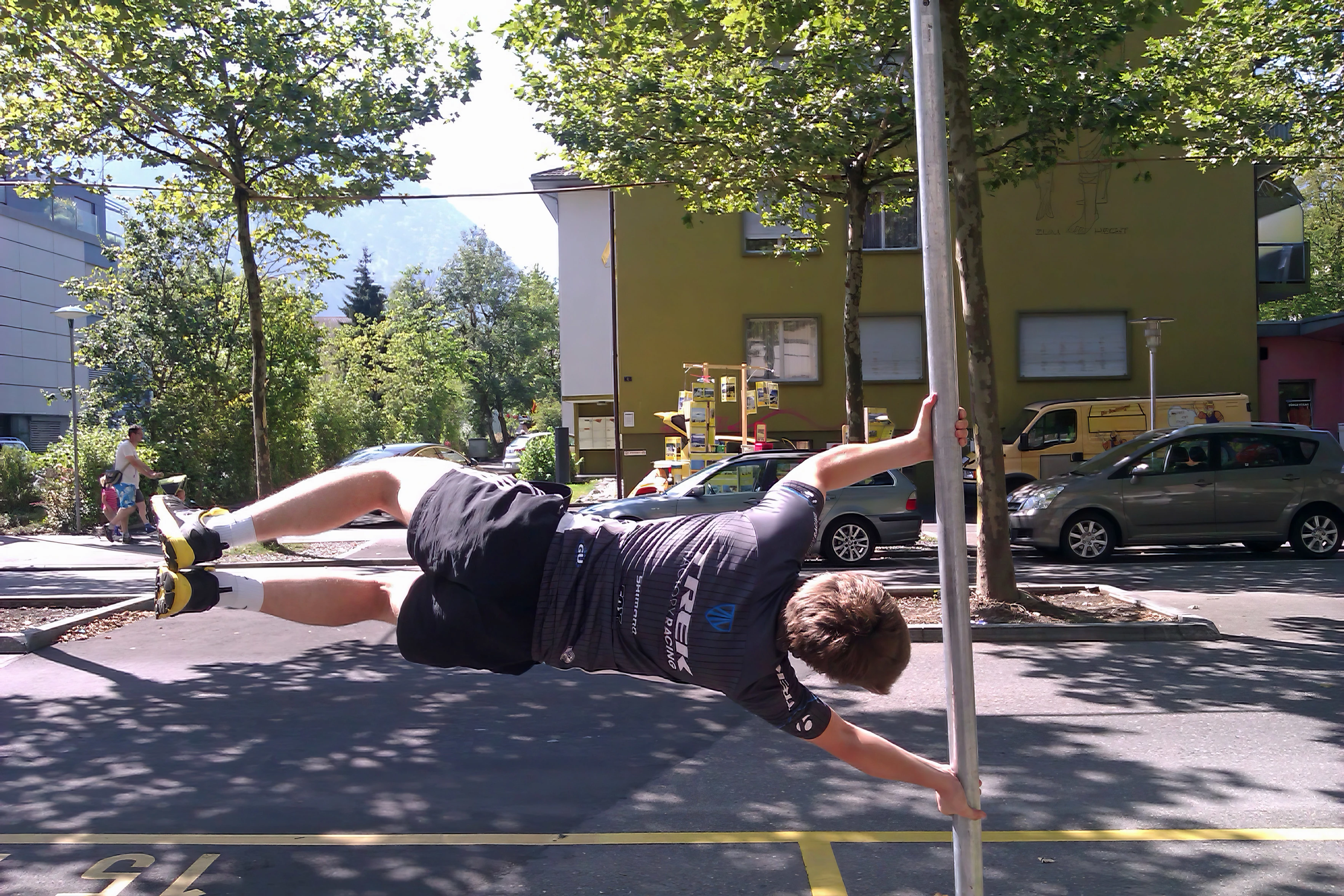 Ash’s pole trick, one last time for John’s camera, outside Interlaken Youth Hostel