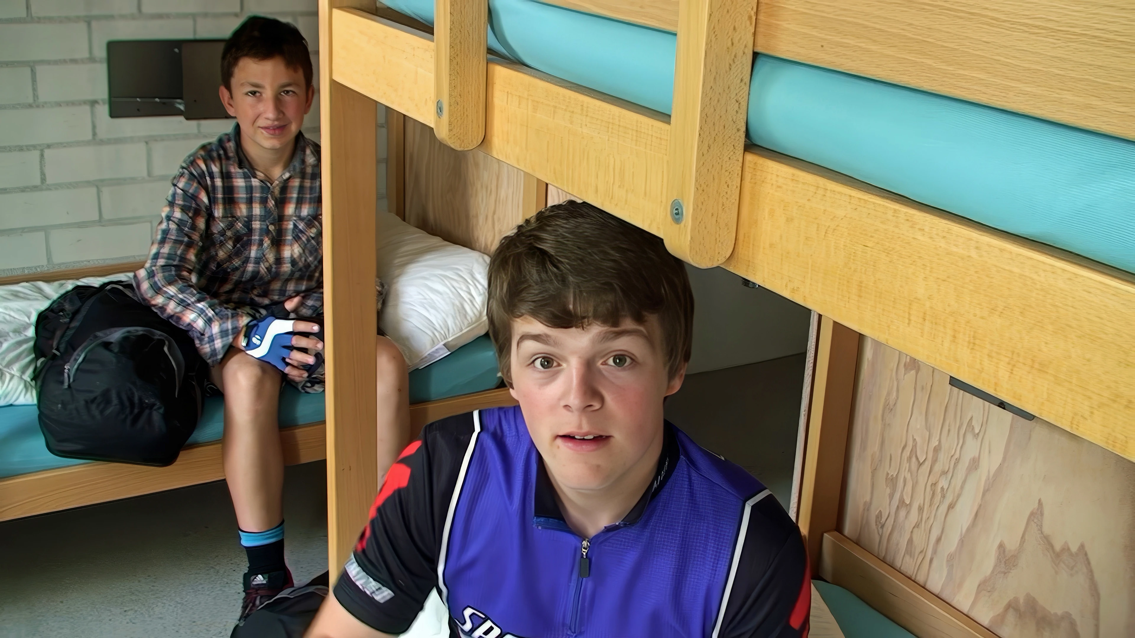 Ash relives the Paris bus driver who cut us up, at Basel Youth Hostel.