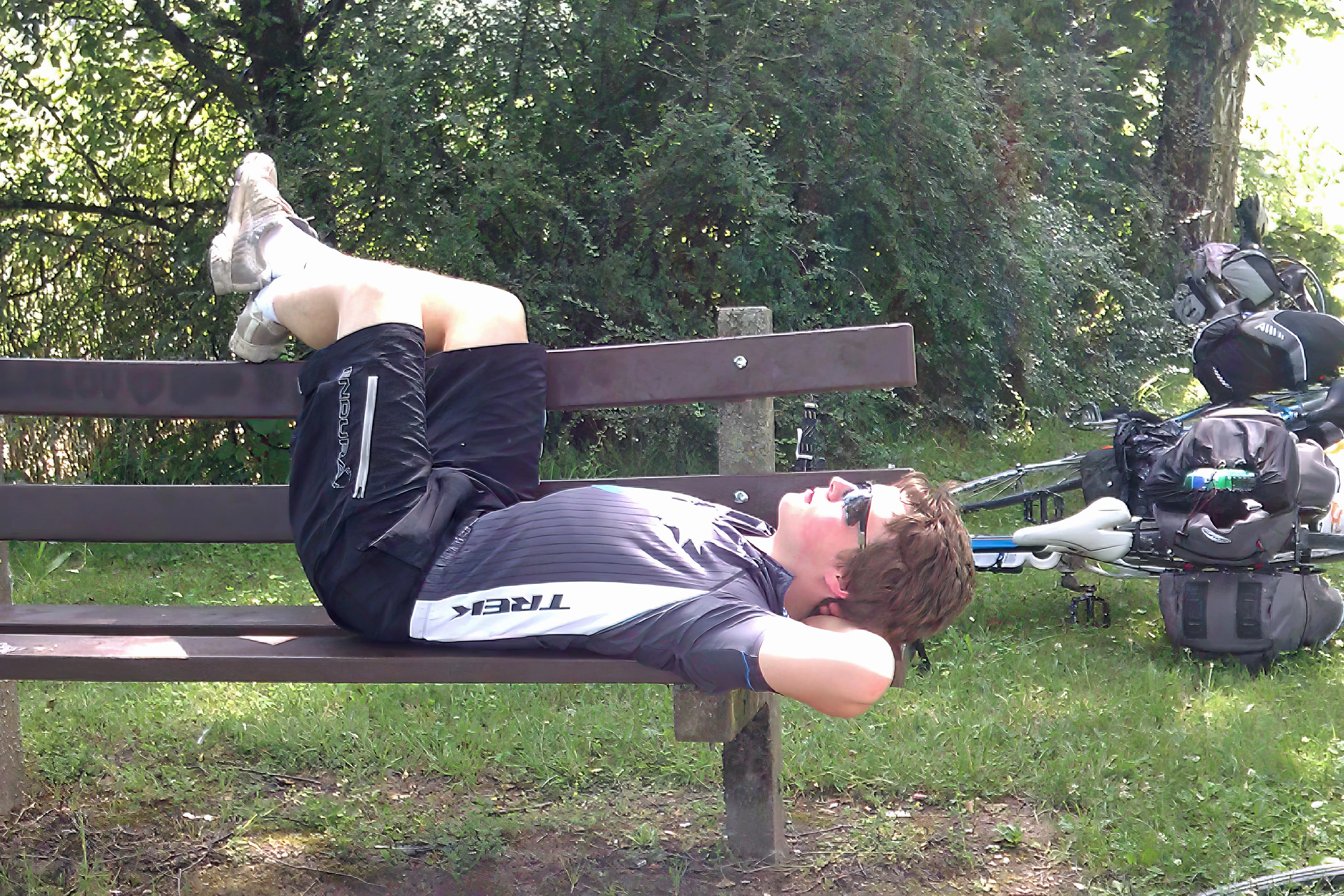 Ash resting in the shade at our Lake Neuchâtel lunch spot near Yvonand.