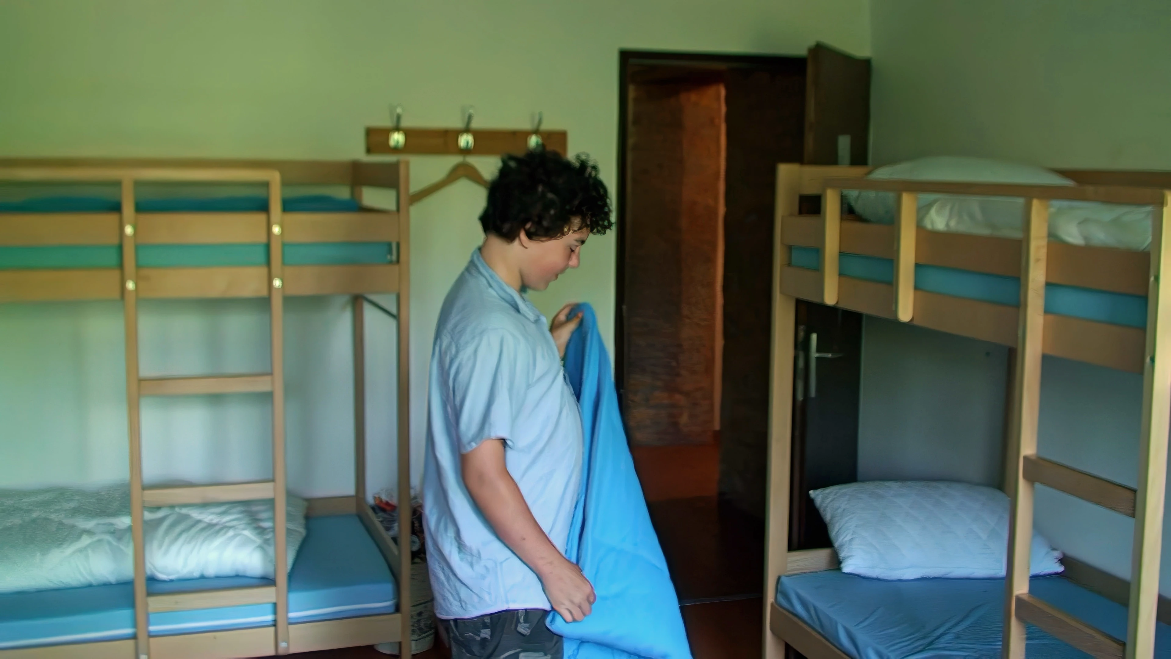 Lawrence tidies his bed as we pack to leave Avenches Youth Hostel.