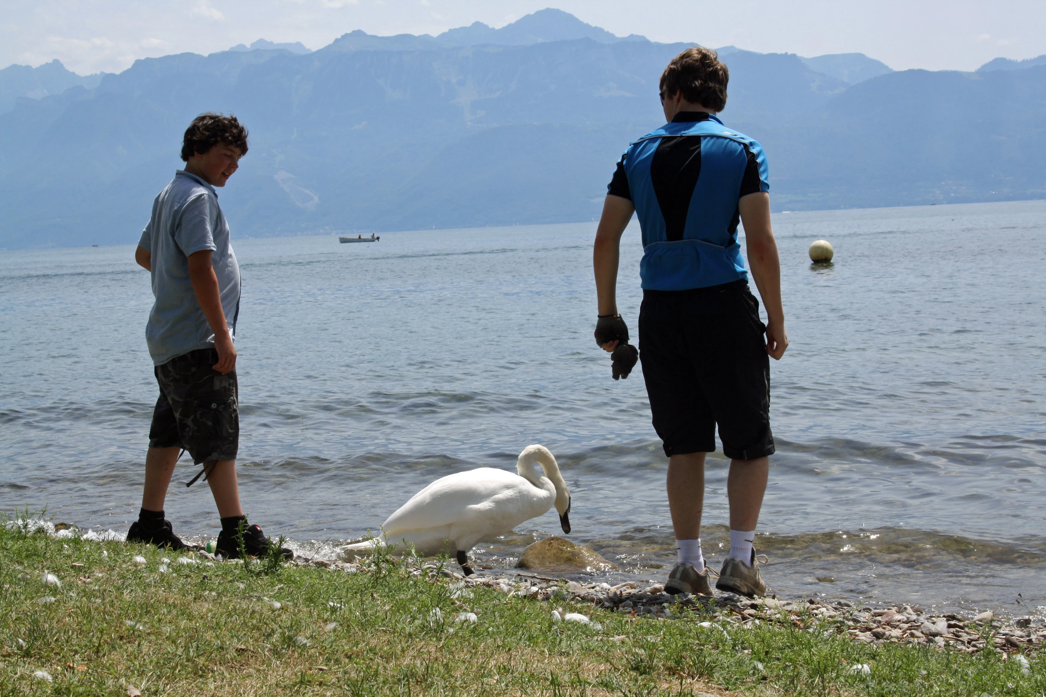 Lawrence, Ash and the swan on the beach near Ouchy Quay.