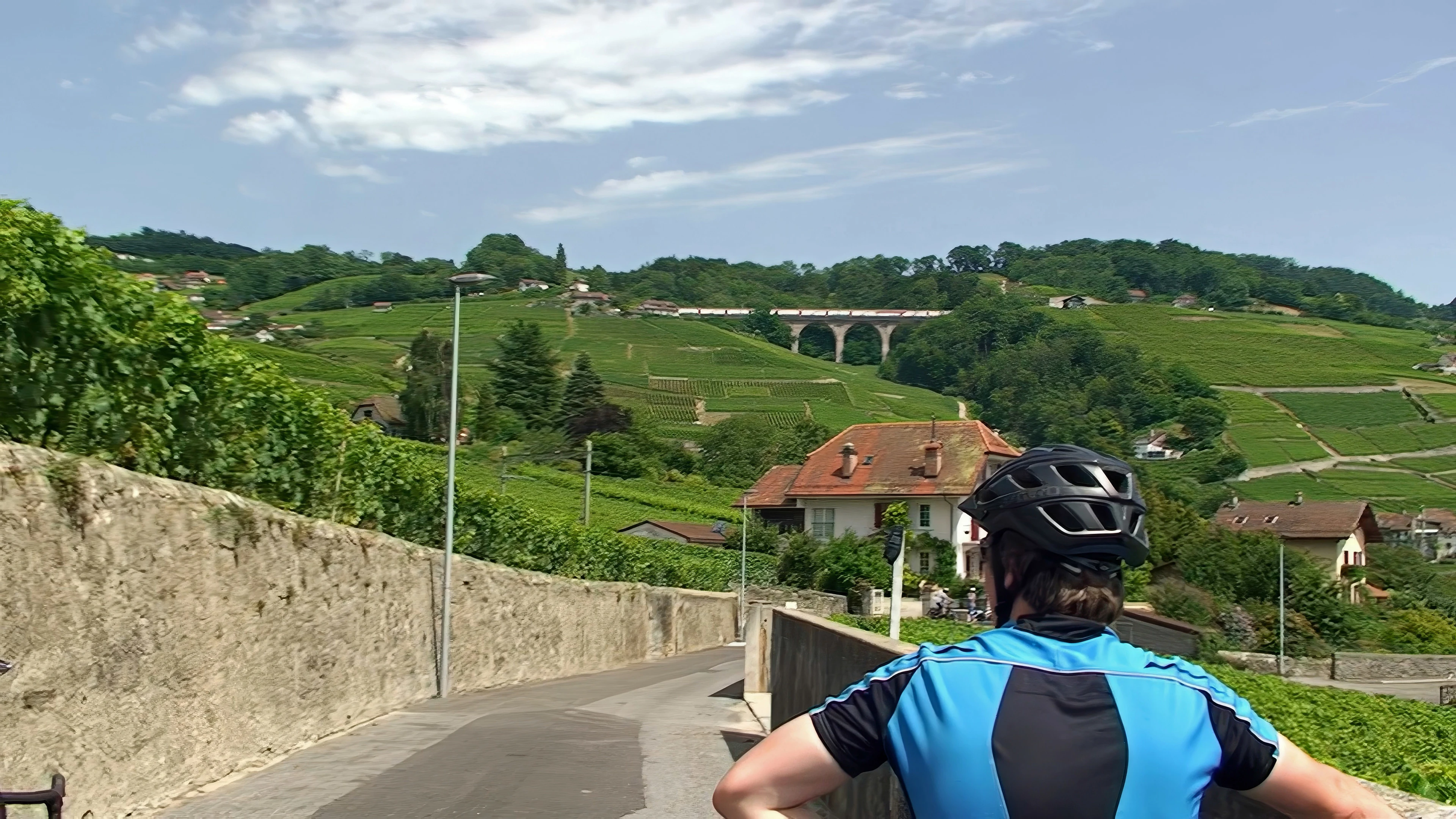 Through the vineyards at Chemin de Plantaz, Lutry, as a train crosses the viaduct. 7.6 miles in.