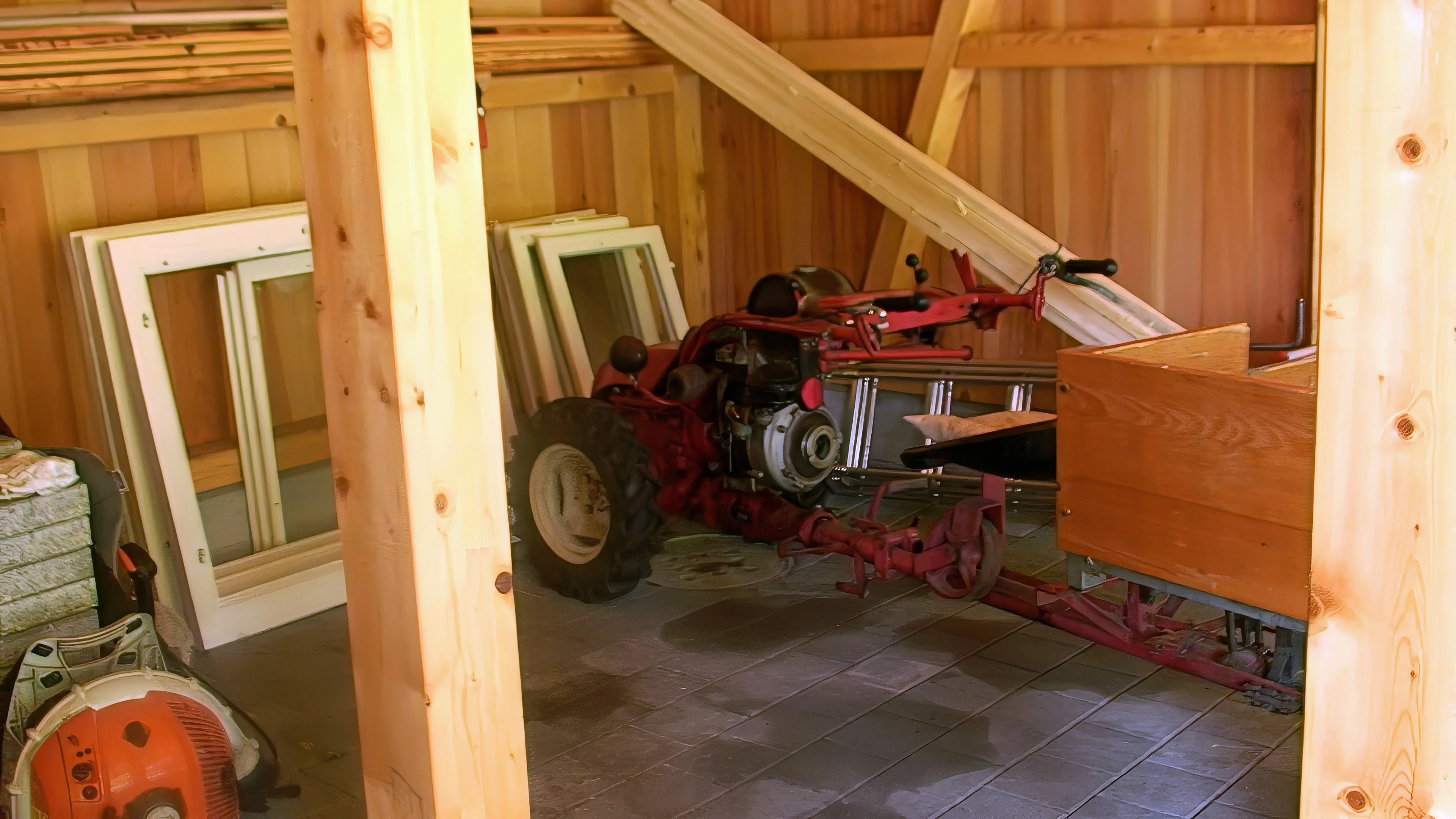 An unusual mini-tractor in a barn at Sengg, 9.9 miles in