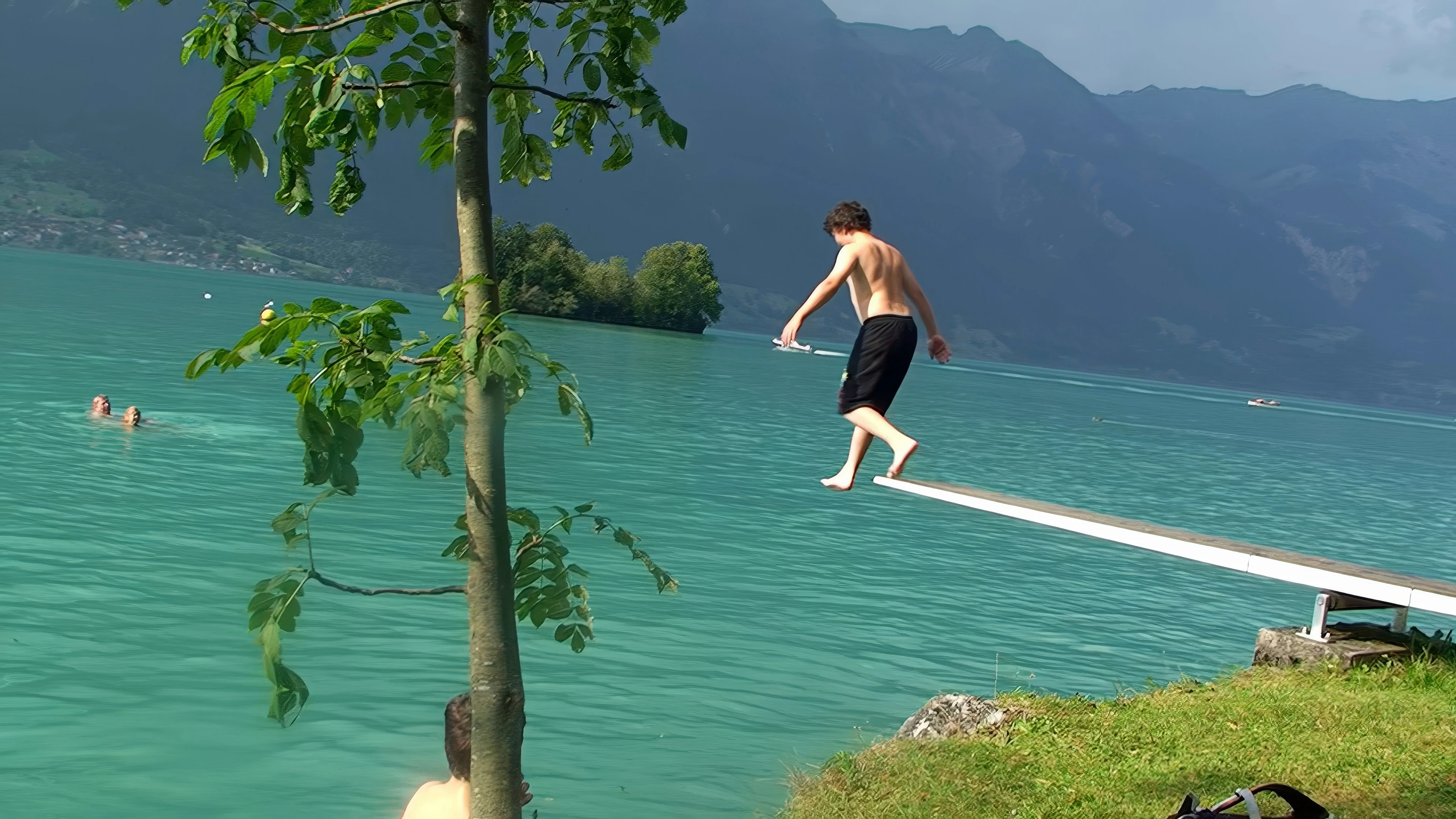 Lawrence takes the plunge at Iseltwald Camping and Lido, 11.3 miles into the ride