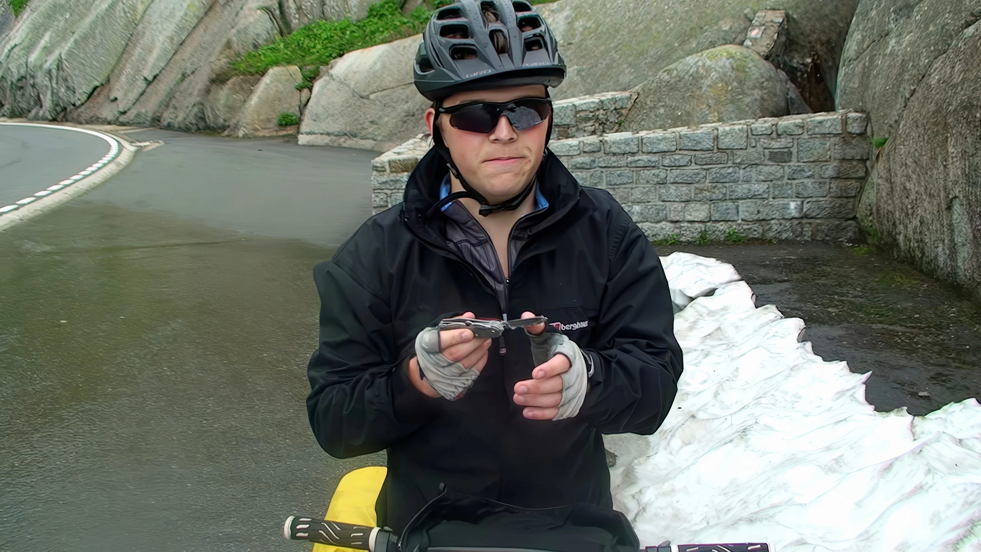 Ash prepares to carve the roadside snow above Lake Grimsel – 27.2 miles, 1947m