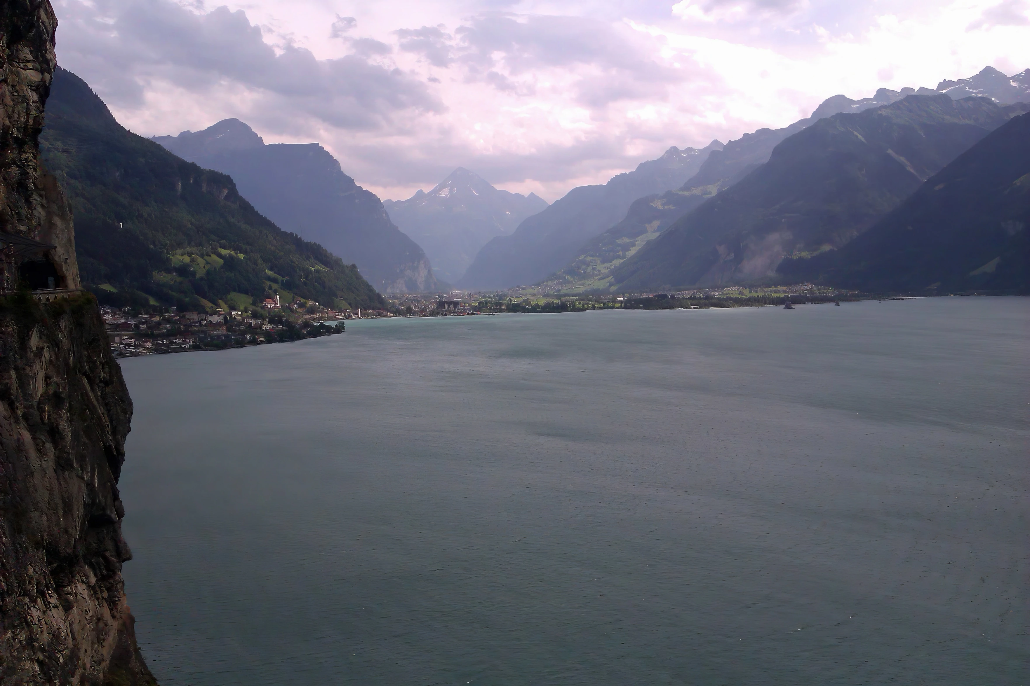 Looking back to Ausserdorf (left) and Seedorf/Altdorf on Lake Urn from our late‑lunch stop, Alte Axenstrasse, Route 3.