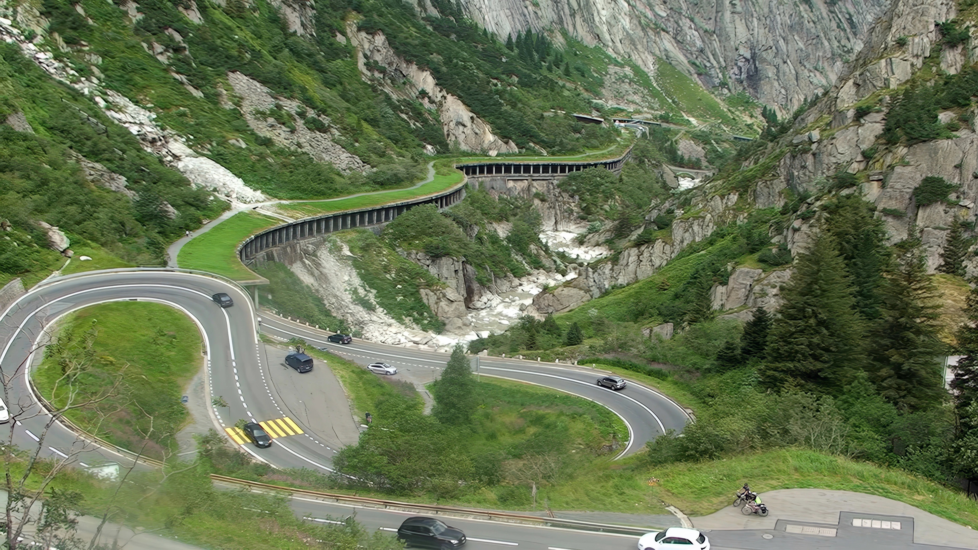 First view of the Schöllenen Gorge, start of a 22‑mile descent, 3.1 miles in.
