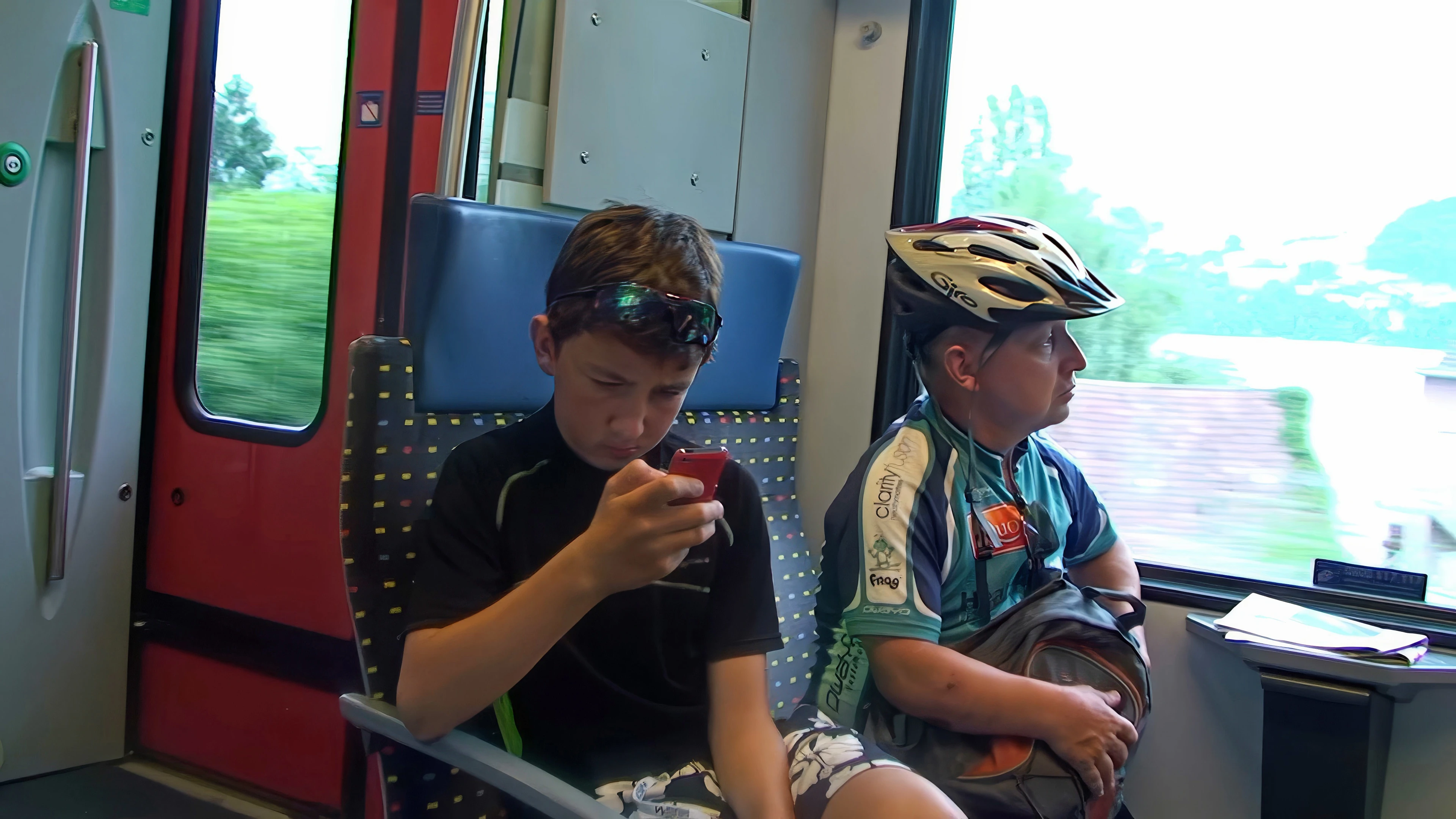 Will and John on the Brunnen–Lucerne train after our 33.4 miles from Hospental.