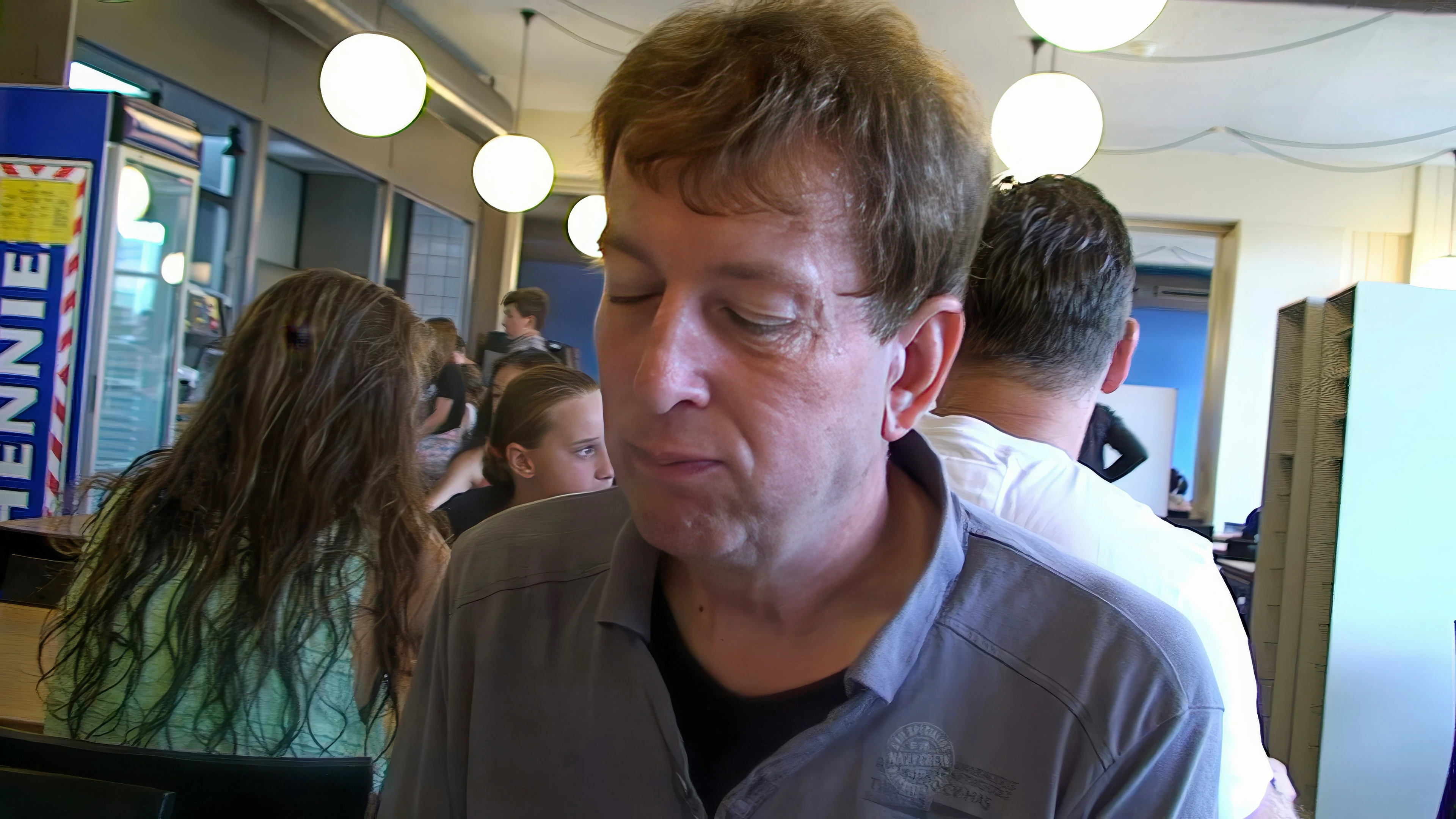 Michael attempts a peaceful breakfast at Lucerne Youth Hostel.