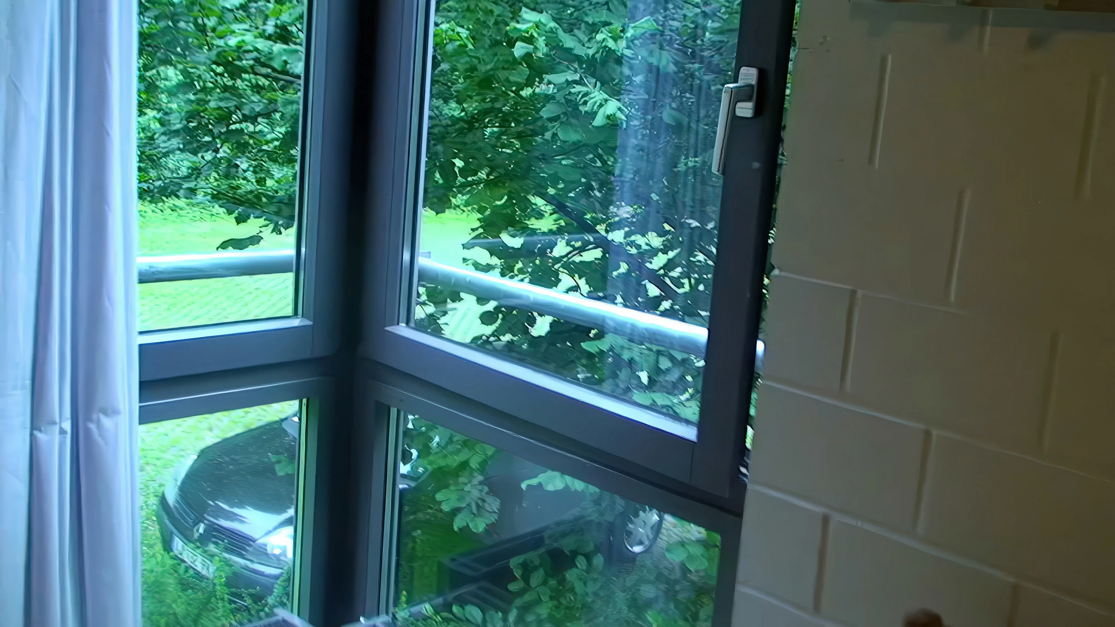 Modern dorm window overlooking the grounds at Lucerne Youth Hostel.