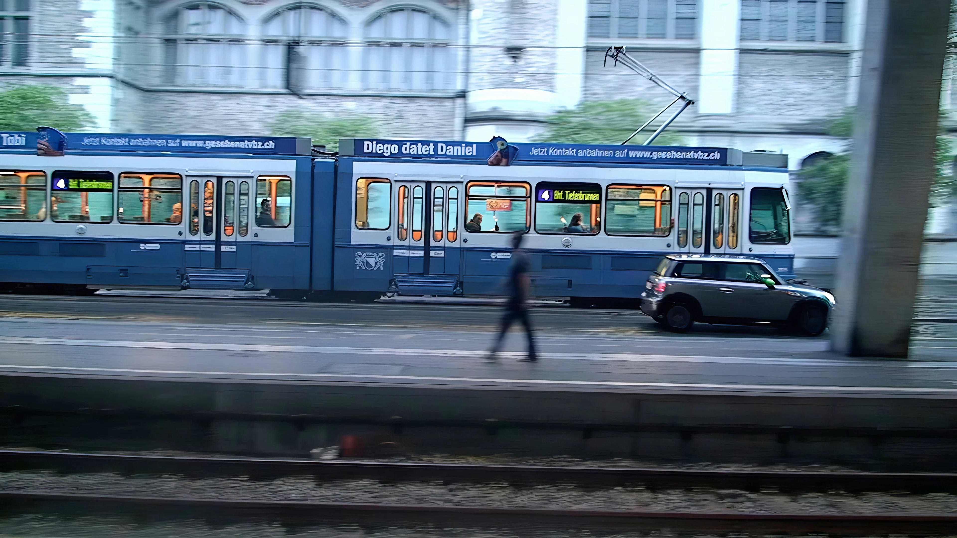 Trams passing Zurich station on a very wet morning.