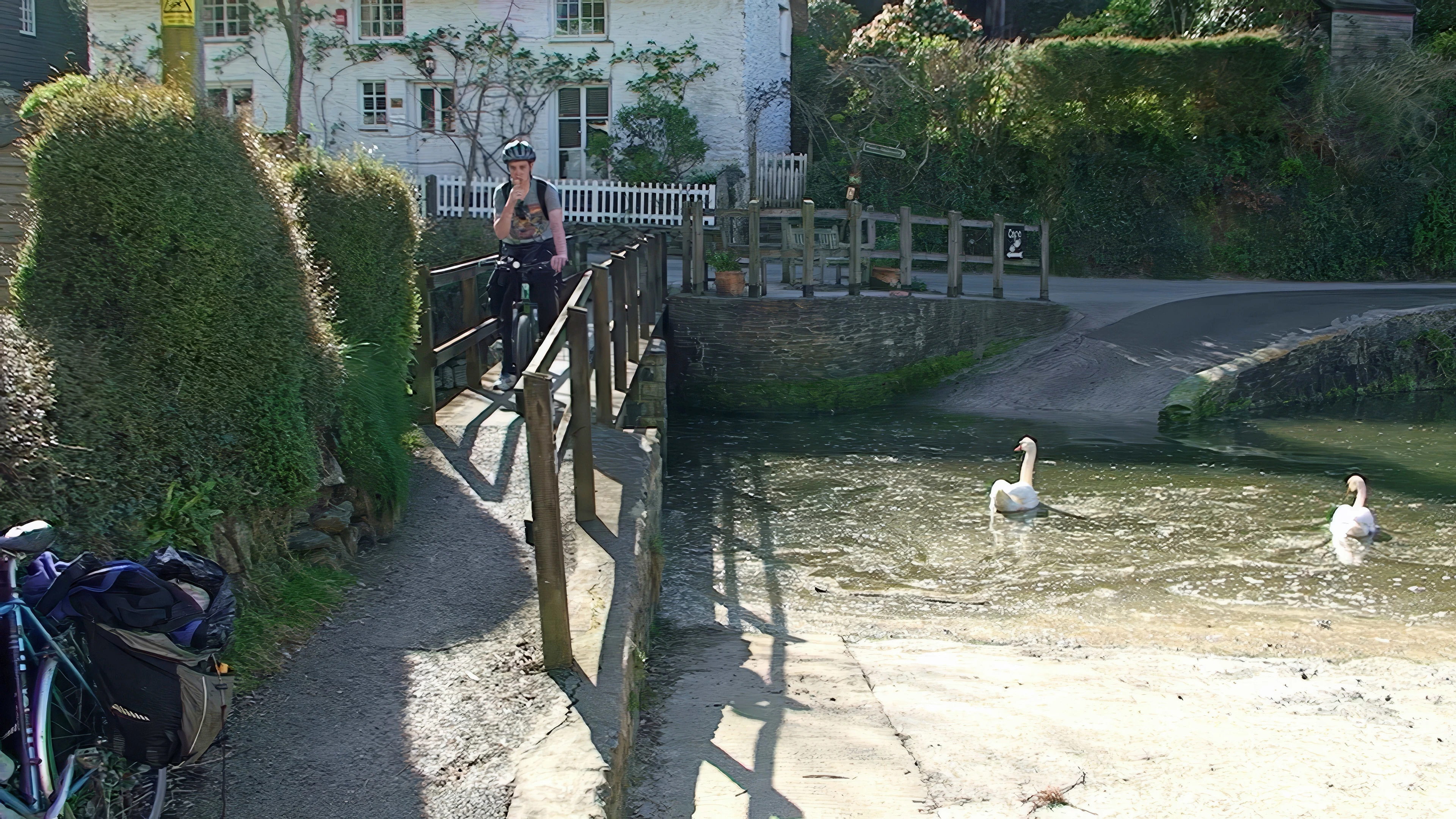 Callum crosses the ford the easy way, behind Helford Village