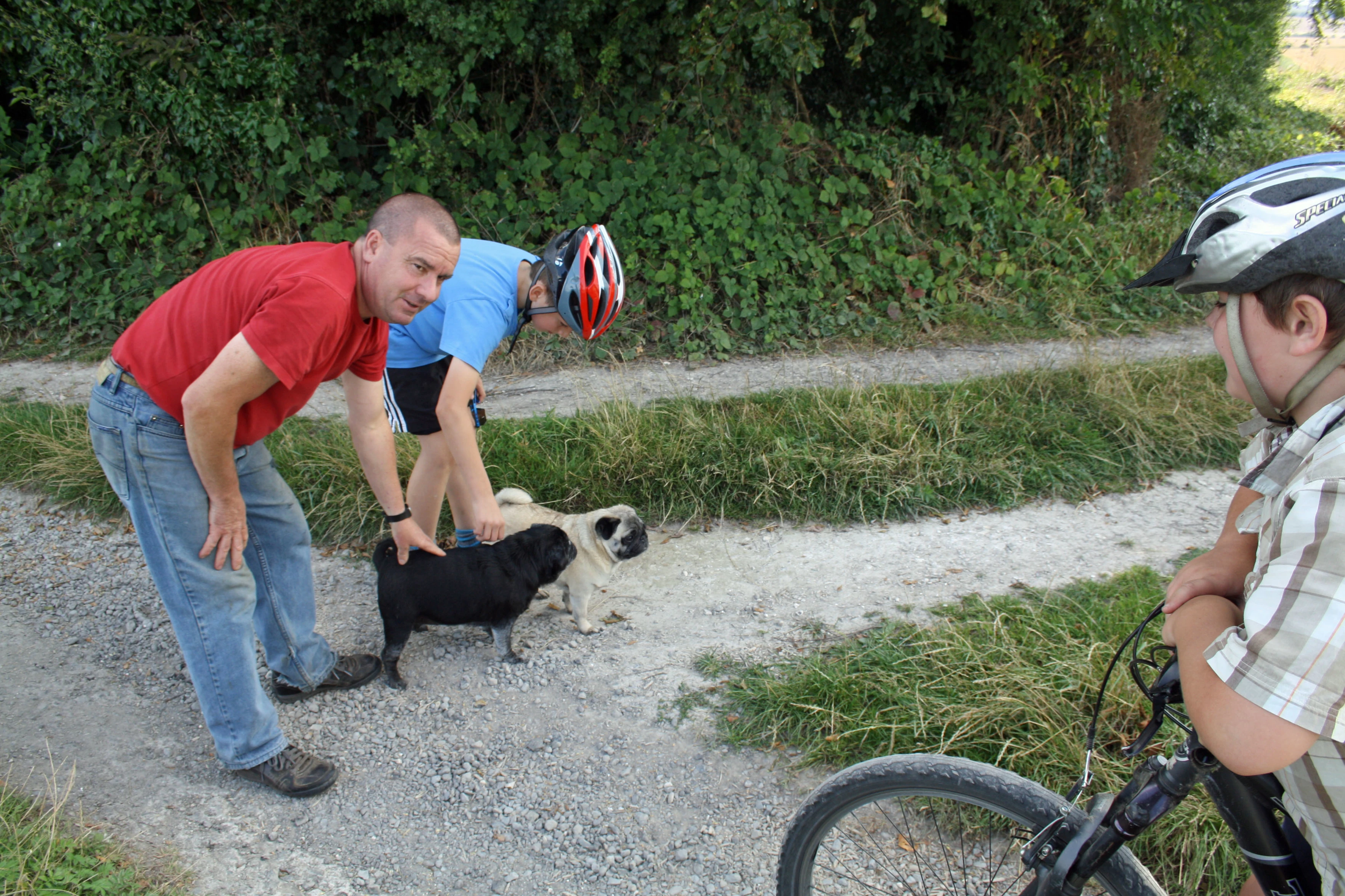 George meets two pugs and their owner near Wells Bottom, New Court Down, on the Whitsbury–Odstock track.