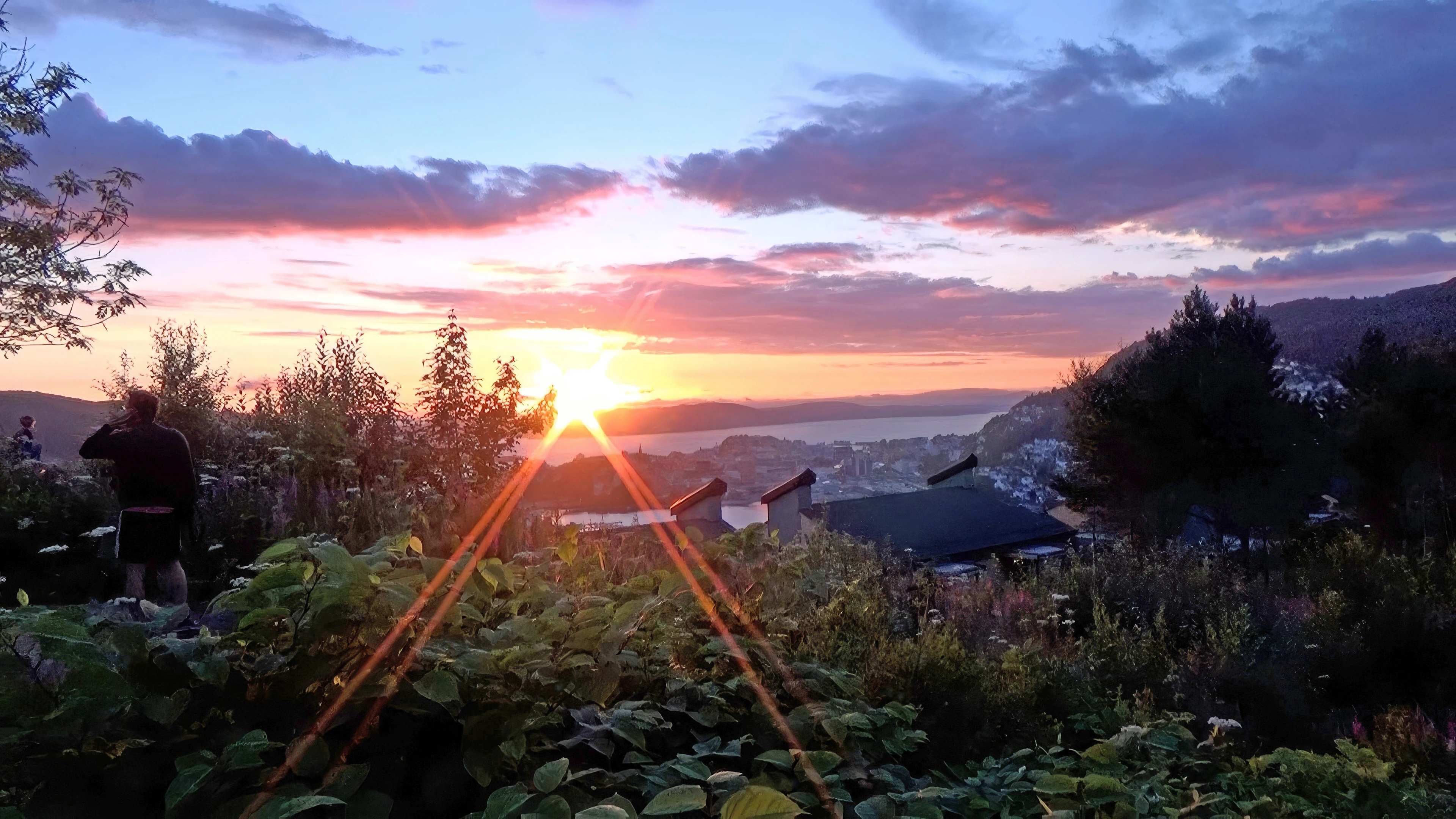 Sunset from Montana Youth Hostel, Bergen, as we tuck into pizza in the gardens.