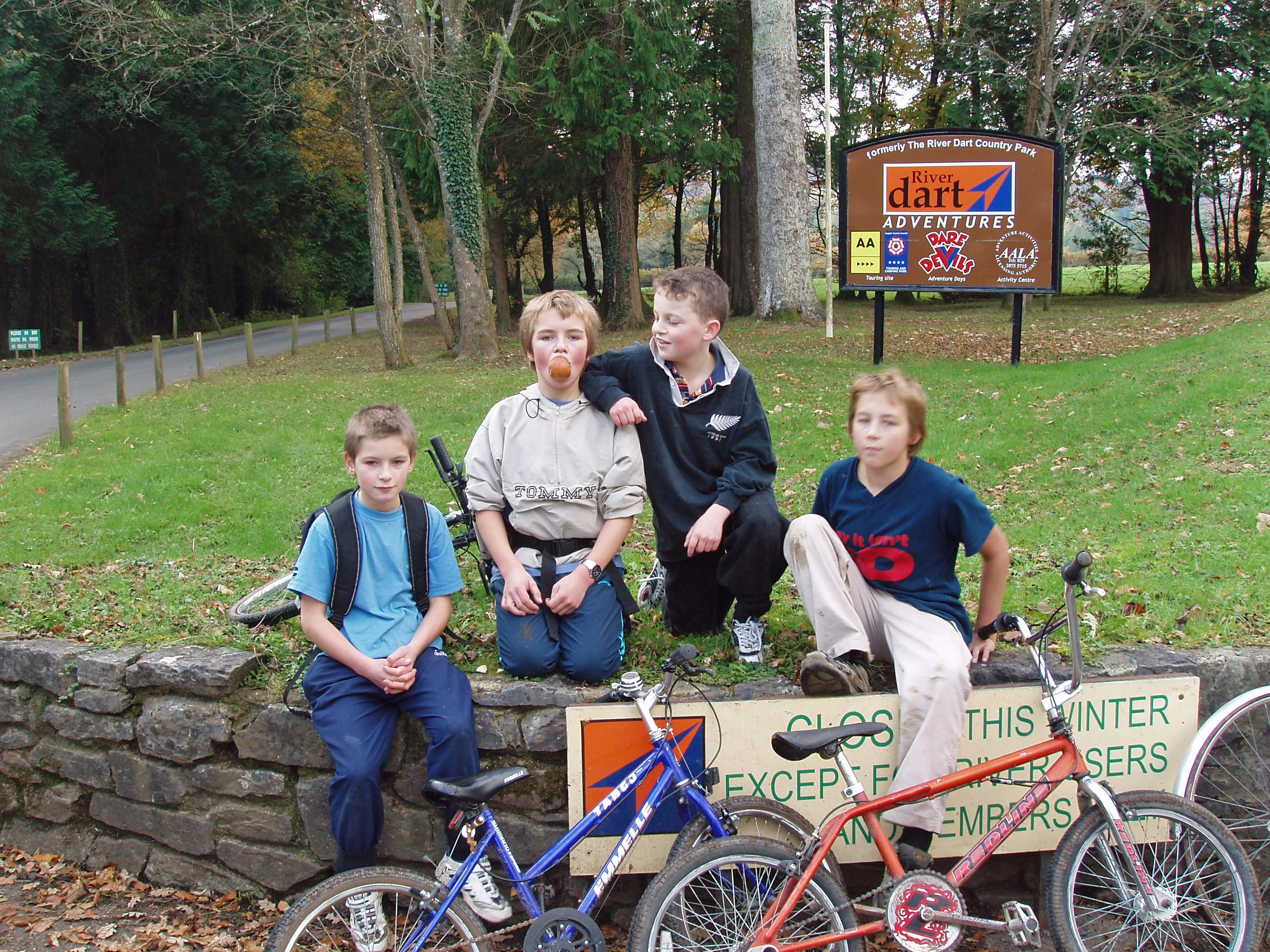 The youngsters at the River Dart Country Park entrance; Josh holds an apple in his mouth.