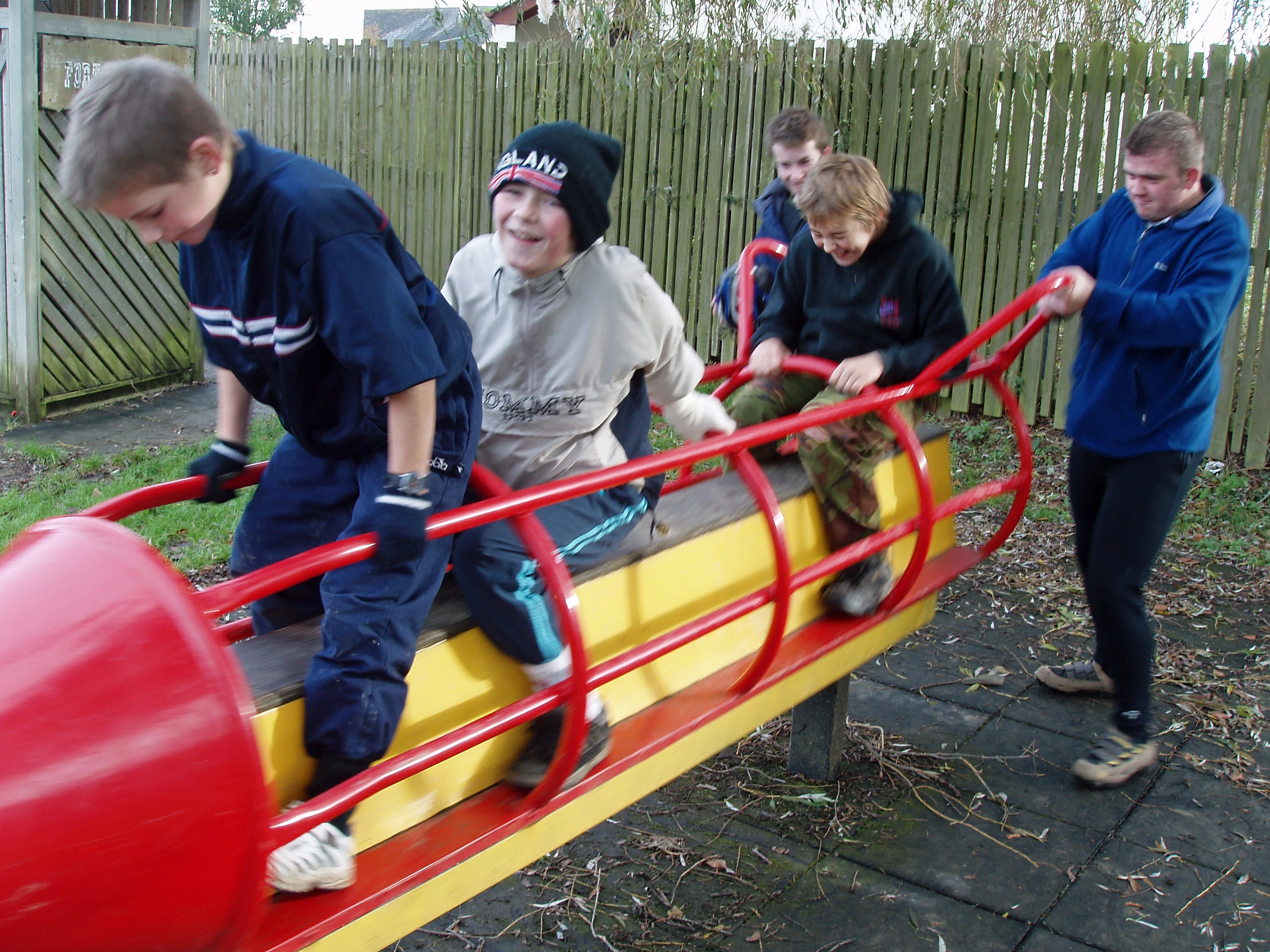 Joe and Gavin give the youngsters a rough ride on the Rocket Rider at Broadhempston play park.
