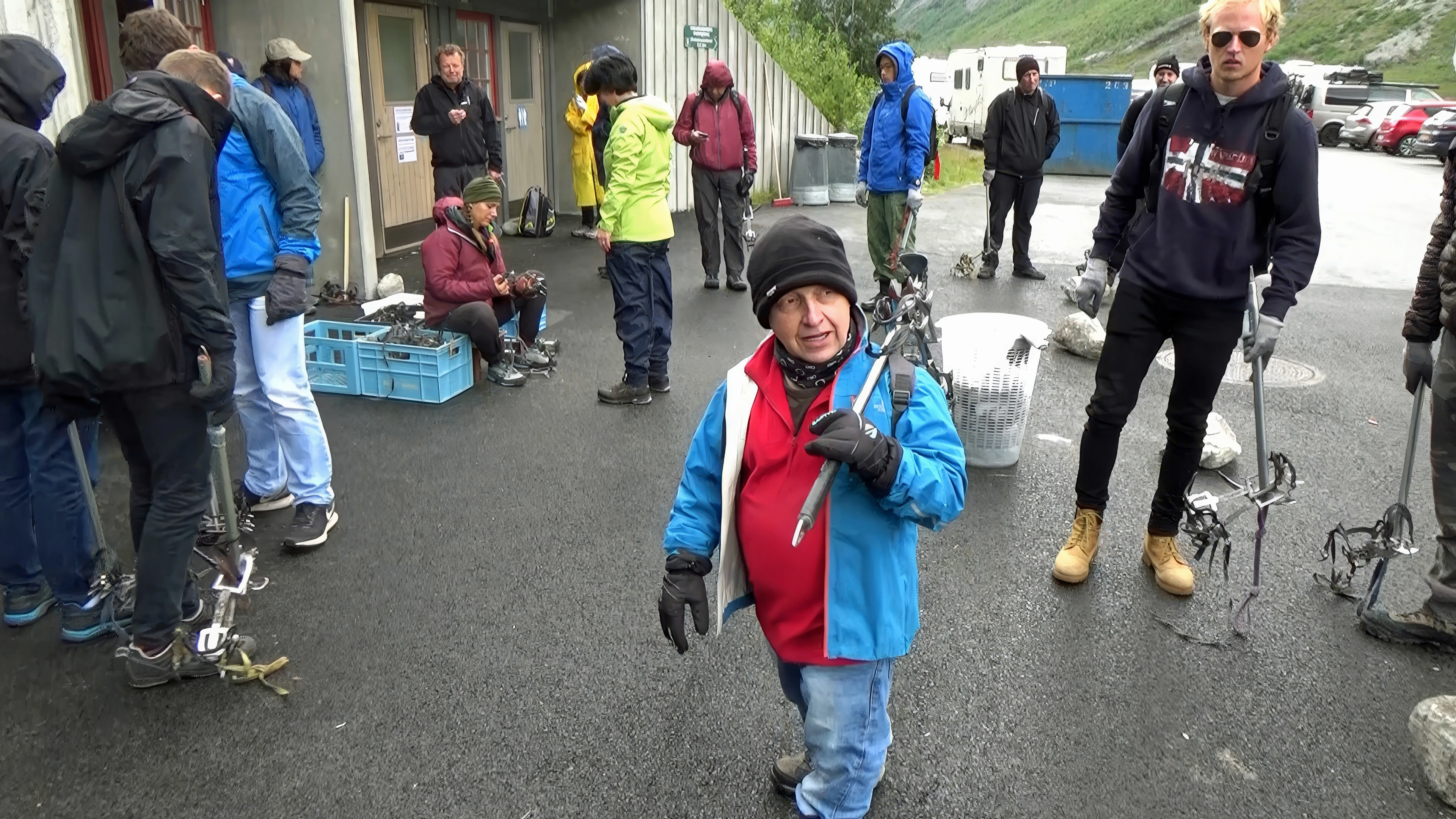 John kitted out for our glacier walk outside the equipment centre.