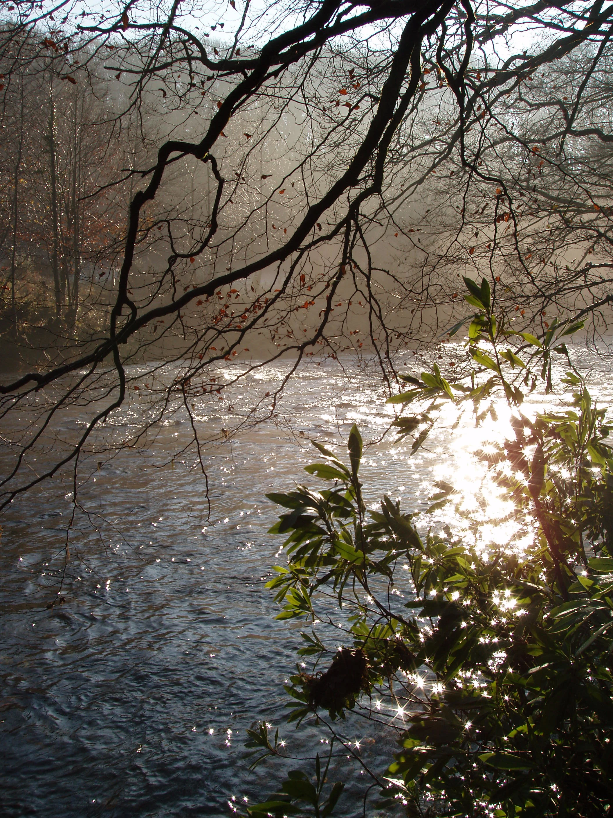 River Dart from Hembury Woods, sunlight gleaming off the water.