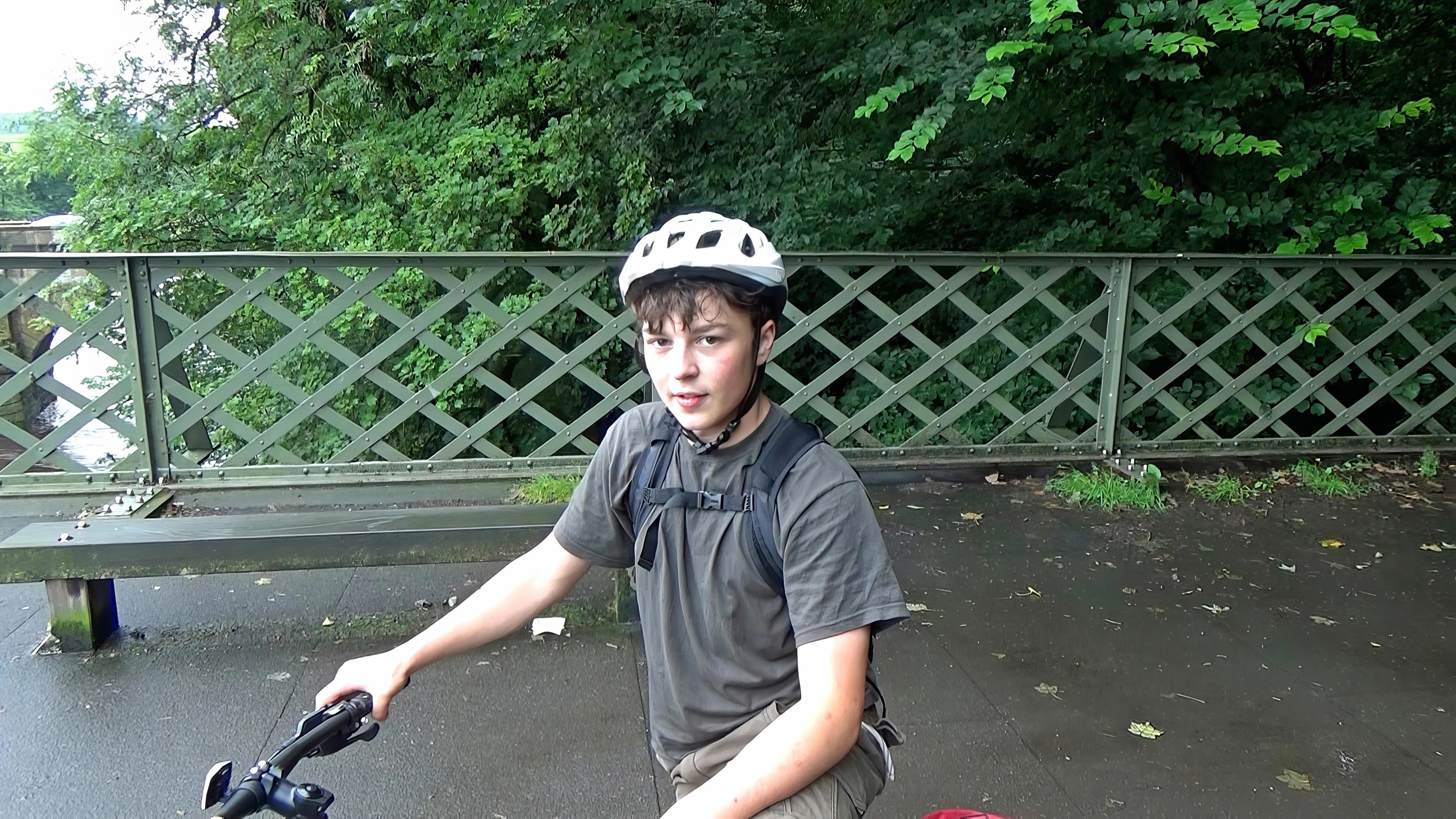 Lawrence on Caton Lune Bridge, recounting his sprint back to Starbucks in Lancaster for a forgotten helmet.