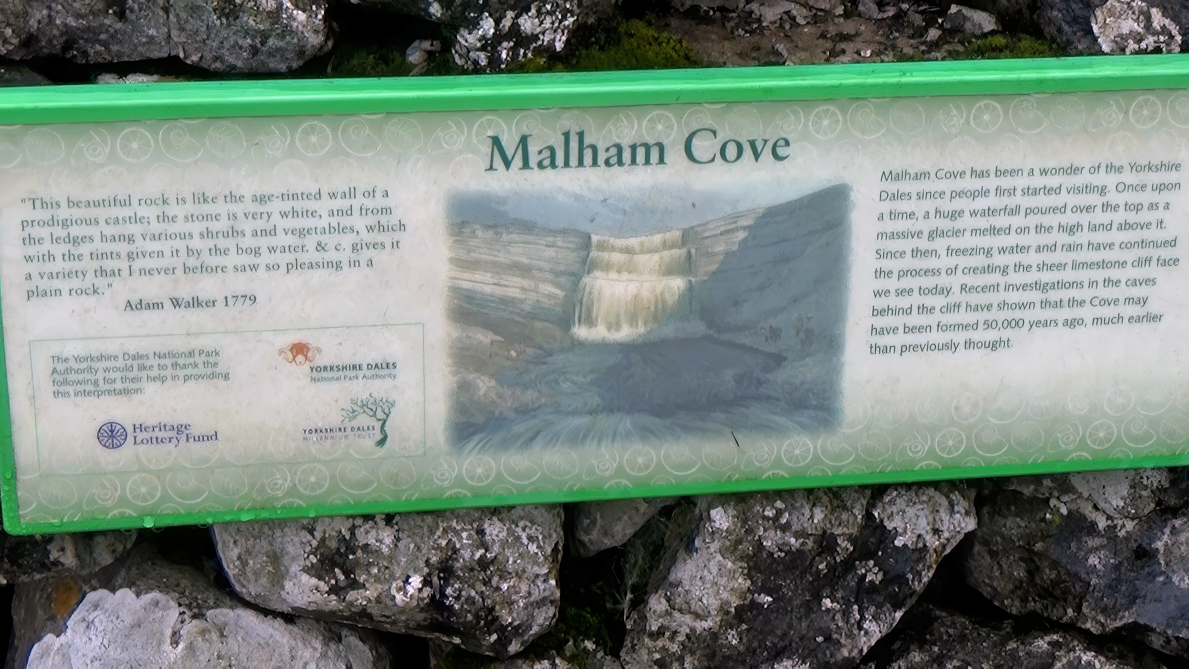 Wall-mounted information board by Malham Cove.
