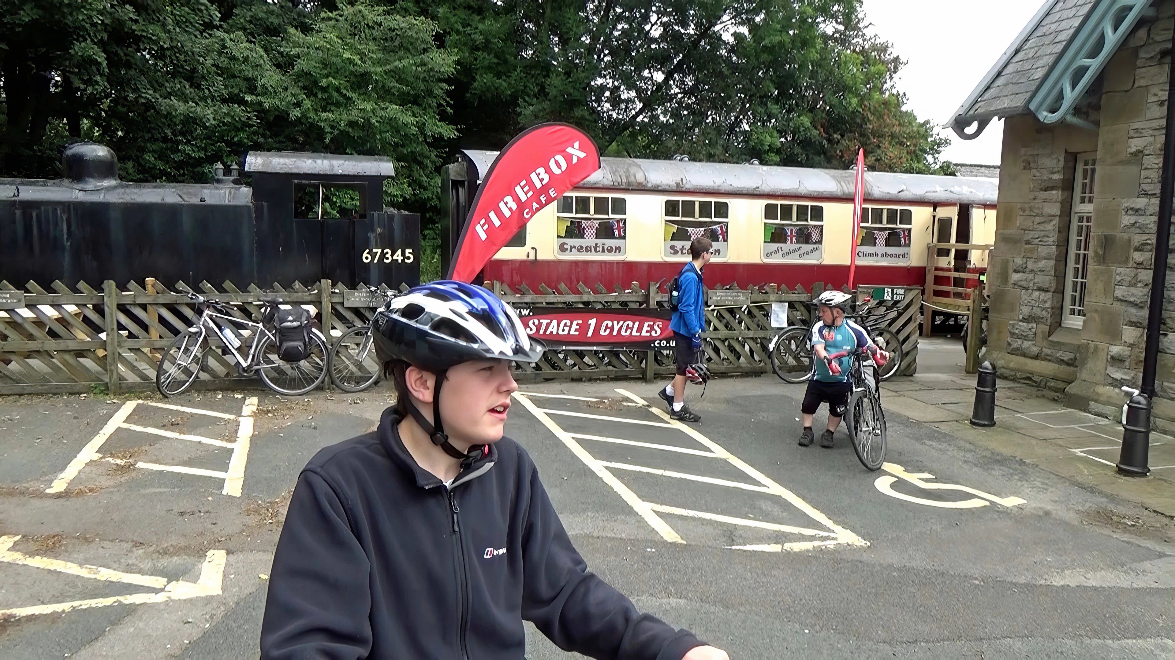 Leaving Stage 1 Cycles and Firebox Café in the old station at Hawes, after Michael’s 10am spoke fix
