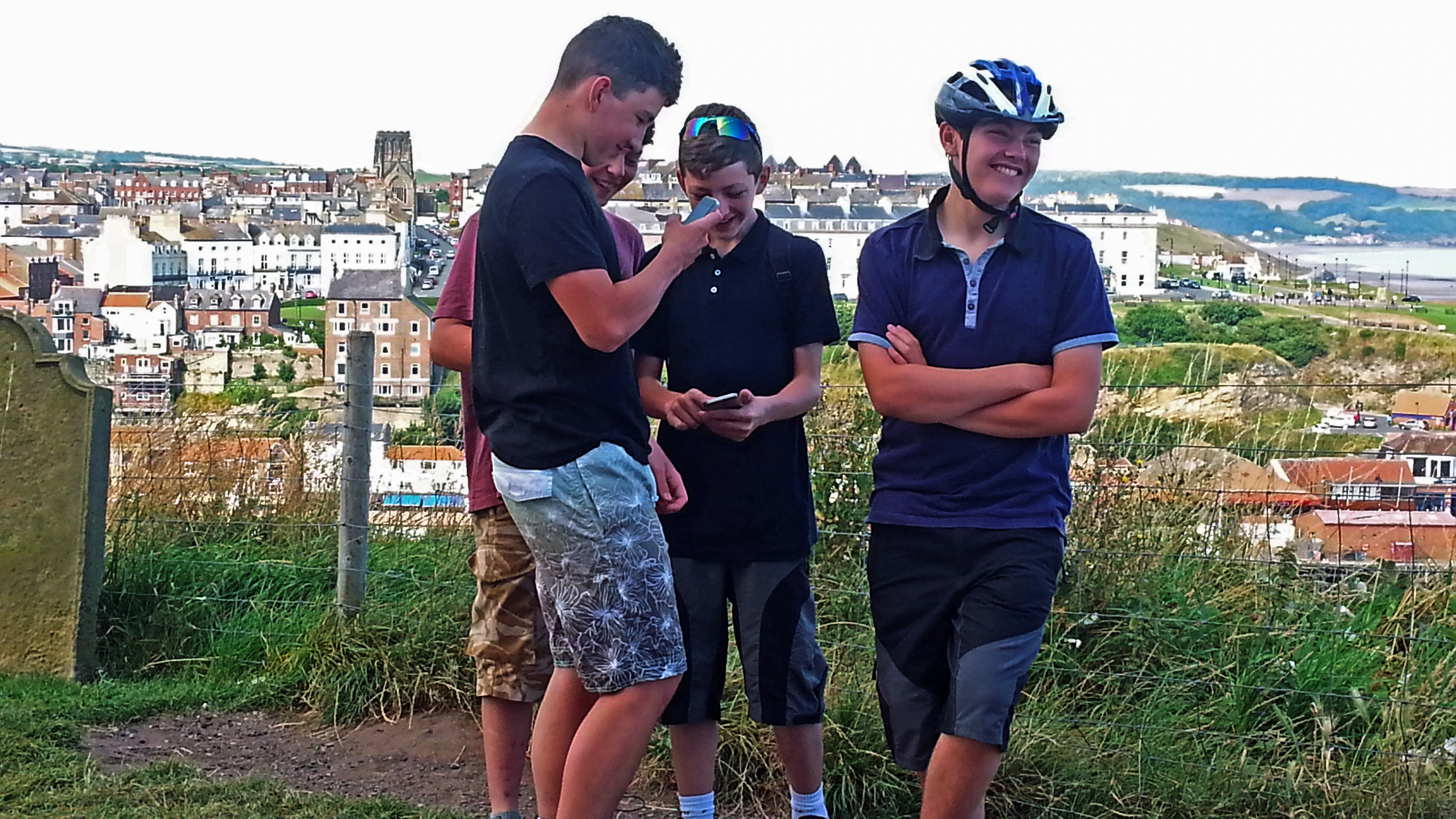 Post-group-shot phone antics: Lawrence, Dillan, George and Will, St Mary’s, Whitby