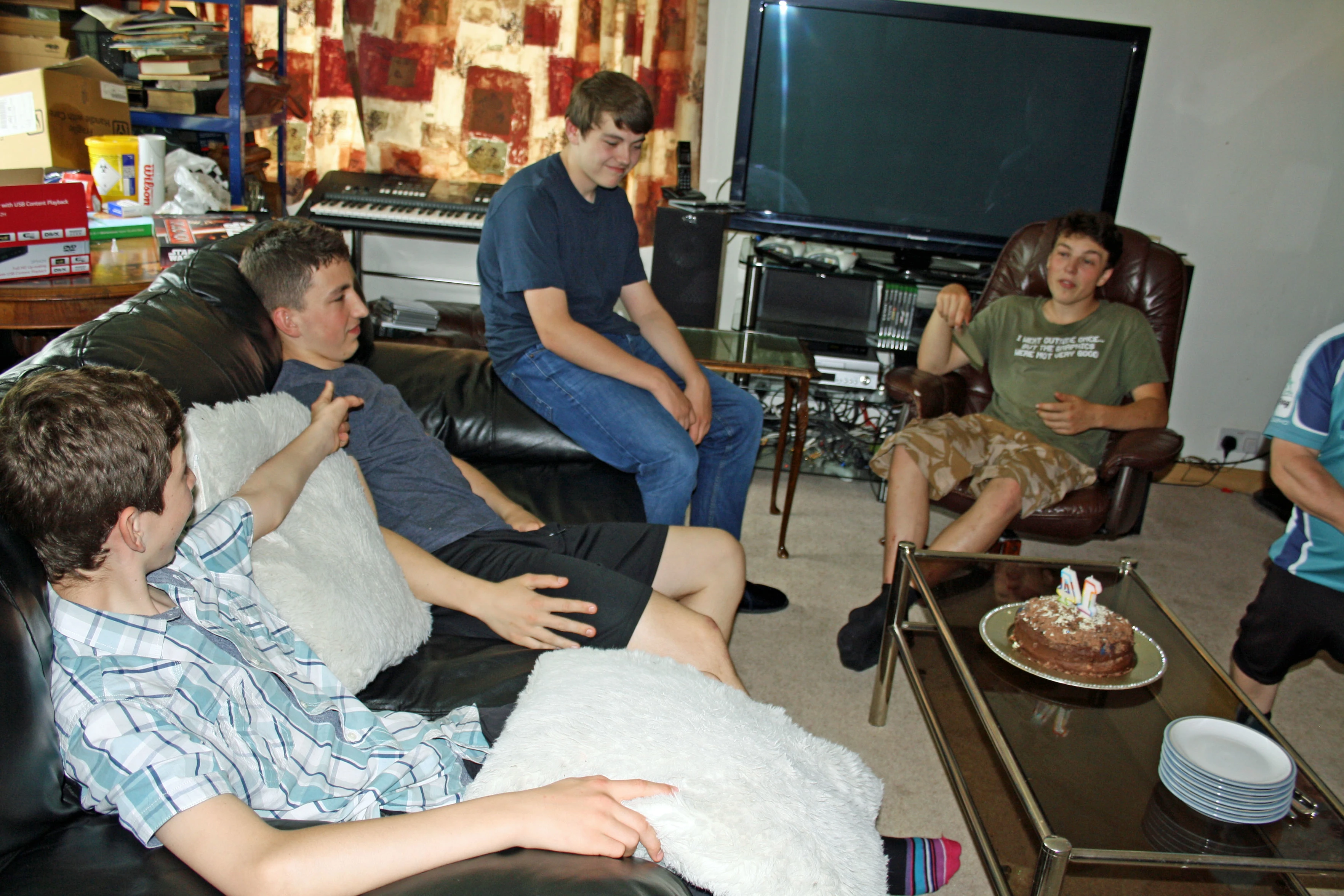 Sharing out Lawrence’s homemade chocolate cake at Crofters for George’s birthday.