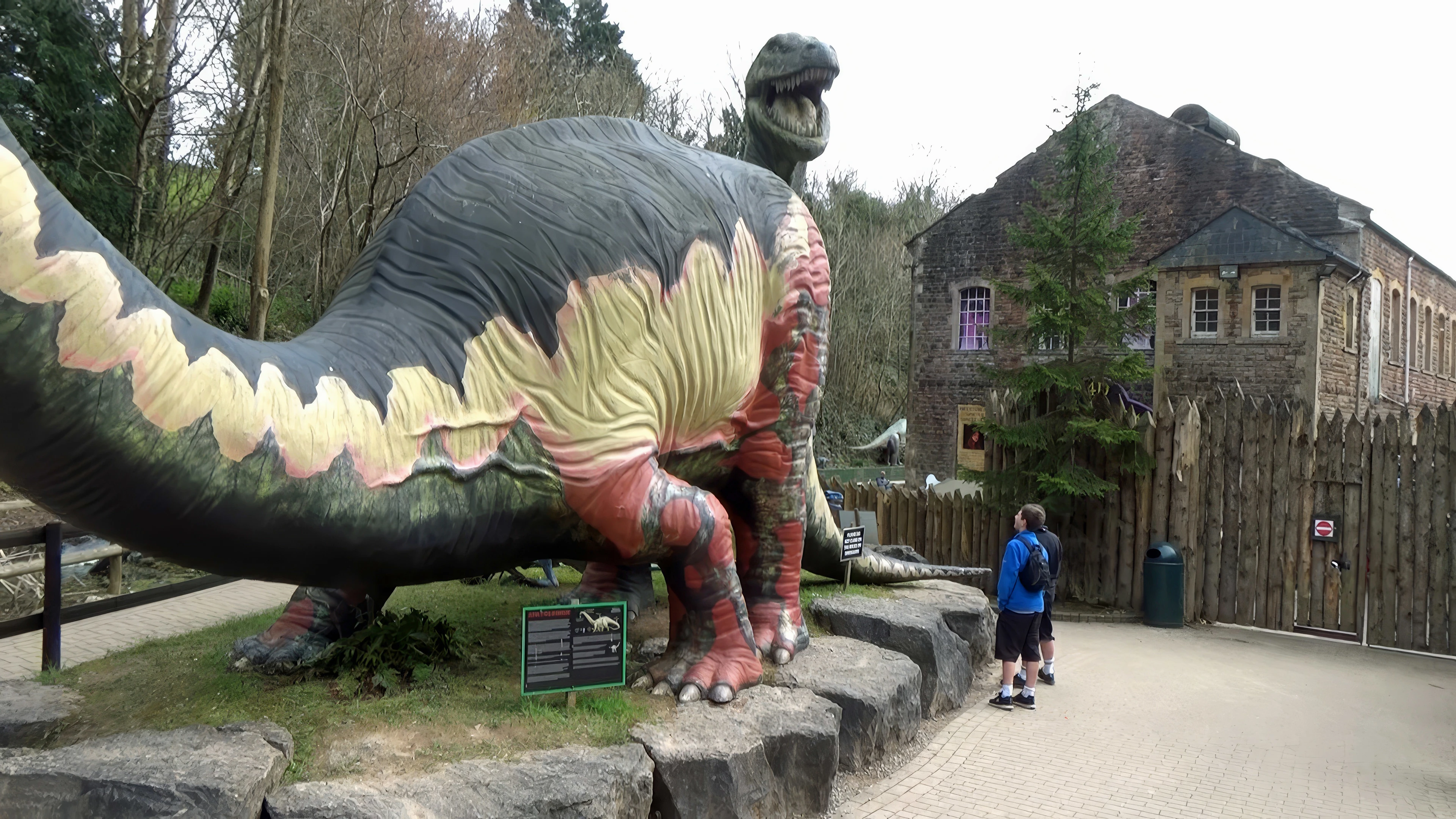 Dillan and George with the brachiosaurus in Dinosaur Grove, Wookey Hole.